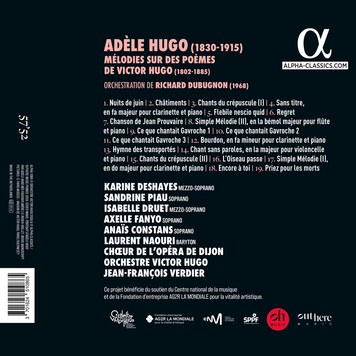 Dieses Album ist eine Hommage an die Komponistin Adèle Hugo (1830-1915), das fünfte Kind des großen Dichters Victor Hugo. Sie litt unter lebenslanger psychischer Instabilität und verbrachte die Hälfte ihres tragischen Lebens in psychiatrischen Anstalten. Sie hatte ein überschwängliches und sensibles Temperament; schon in jungen Jahren begeisterte sie sich leidenschaftlich für die Musik, studierte Klavier und später Komposition. Vor kurzem wurden ihre musikalischen Manuskripte wiederentdeckt, und der Direktor der Victor-Hugo-Museen in Paris und Guernsey vertraute sie dem Komponisten Richard Dubugnon an, um das Puzzle dieser oft sehr fragmentarischen Partituren, die mehr als ein Jahrhundert lang in Vergessenheit geraten waren, zu erforschen und zu rekonstruieren. Herausgekommen ist eine Sammlung von vierzehn ihrer Lieder, Vertonungen der Gedichte von Victor Hugo und Verse aus seinem großen Roman „Les Misérables“ sowie fünf Lieder ohne Worte. Passenderweise waren das Orchestre Victor Hugo und sein Musikdirektor Jean-François Verdier an dem Projekt beteiligt und luden Dubugnon ein, die Stücke zu orchestrieren, die hier von einem Team aus namhaften Sängerinnen und Sängern verschiedener Generationen präsentiert werden.