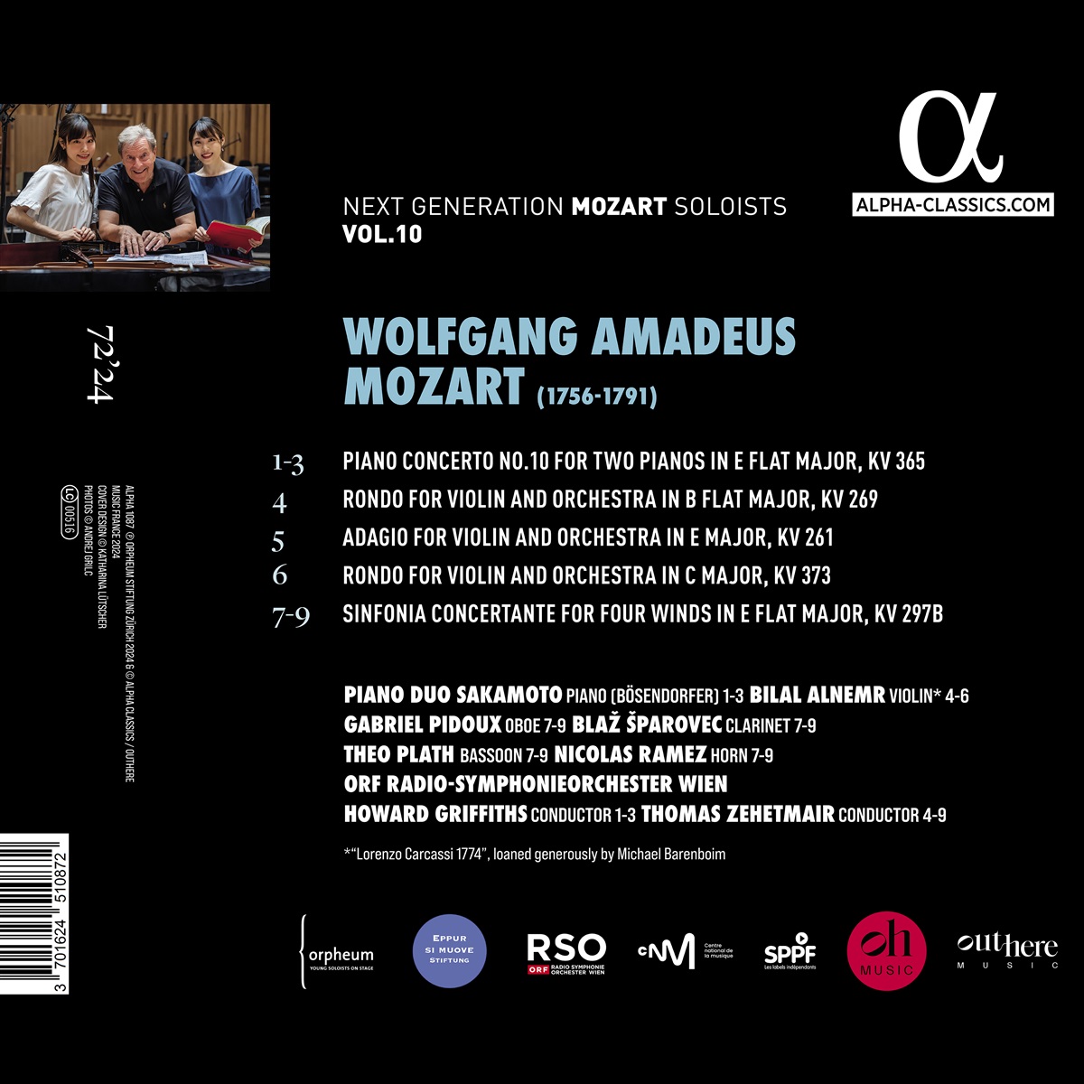 Dieser zehnte Band der Reihe „Next Generation Mozart Soloists“ präsentiert Werke, die seltener aufgenommen werden, darunter ein Konzert für zwei Klaviere (in der Originalbesetzung), separate Sätze für Violine und Orchester (ein Adagio und zwei Rondos) und - in Anlehnung an das barocke Concerto grosso - die Symphonie concertante für Oboe, Klarinette, Horn, Fagott und Orchester. Es ist eine Gelegenheit, eine Reihe hervorragender Solisten mit sehr unterschiedlichen Hintergründen zu entdecken: das Klavierduo Sakamoto, 2021 Preisträger des renommierten ARD-Wettbewerbs in München; der syrische Geiger Bilal Alnemr, Mitglied des West-Eastern Divan Orchestra; die Franzosen Nicolas Ramez, ebenfalls ARD-Preisträger, und Gabriel Pidoux, der bereits Alpha ein Album (ALPHA789) aufgenommen hat; Theo Plath, Solofagottist des Frankfurter Rundfunkorchesters, und Blaž Sparovec, Soloklarinettist des Gürzenich-Orchesters in Köln.