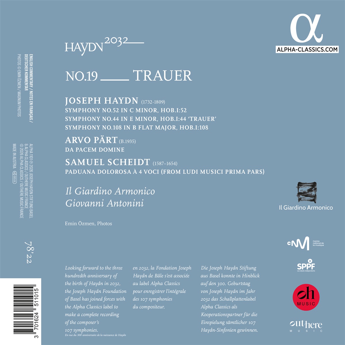 Die Veröffentlichung der mittlerweile 19. Folge der Gesamtaufnahme von Haydns Sinfonien fällt mit dem 40. Jubiläum von Il Giardino Armonico zusammen. Das Ensemble wurde von Giovanni Antonini, dem künstlerischen Leiter der Serie HAYDN2032 gegründet. Il Giardino hat sich mit seiner revolutionären Auffassung von Vivaldis Musik einen Namen in der Barockwelt gemacht, doch auch Haydn ist seit langem Teil der Geschichte des italienischen Ensembles. Die auf diesem Album enthaltene Sinfonie Nr. 44 war das erste Werk Haydns, das das Ensemble unter Antonini aufführte. Der Titel dieser Symphonie, bekannt als „Trauersymphonie”, gab Anlass, Scheidts Paduana Dolorosa, veröffentlicht 1621 zu Beginn des blutigen Dreißigjährigen Krieges, und Arvo Pärts Da pacem Domine, gewidmet dem Gedenken an die Opfer der Bombenanschläge von Madrid 2004, ebenfalls in dieses Programm aufzunehmen: „Ihre kontemplative Beständigkeit übernehmen eine fast kathartische Funktion, die meiner Meinung nach eine perfekte Integration von Musik zeigt, die stilistisch und chronologisch so weit voneinander entfernt ist”, sagt Antonini, der auf diesem Album außerdem die Sinfonien Nr. 108 (1762) und Nr. 52 (1771) dirigiert.