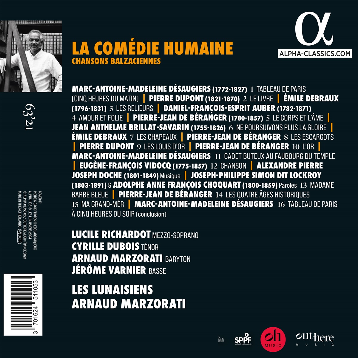 Arnaud Marzorati und seine Sängerinnen und Sänger, ‚Les Lunaisiens‘, sind unübertroffene Spezialisten für die französischen Volkslieder der vergangenen Jahrhunderte. Sie widmen sich zwei Ikonen des 19. Jahrhunderts: dem Schriftsteller Honoré de Balzac und dem Liedermacher Pierre-Jean de Béranger, einem Dichter und Komponisten, der zu seiner Zeit für sein Genie bei der Darstellung der Gesellschaft in ihrer ganzen sozialen Vielfalt, von den Ärmsten bis zu den Reichsten, berühmt war. In dieser Zeit schuf Balzac auch seine scharf gezeichneten Porträts von mehr als 5.000 Figuren in seinem großen Werk von etwa 90 Romanen mit dem Gesamttitel „Die menschliche Komödie“. Die Lunaisiens haben hier eine große Auswahl an geistreichen und oft satirischen Versen vertont, die alle Pariser Themen widerspiegeln, die Balzac beschäftigten: sozialer Aufstieg, Geld und Gier, Korruption, Liebe und Verrat. Unter Mitwirkung von Lucile Richardot und Cyrille Dubois erzählen Arnaud Marzorati und sein Ensemble mit Begeisterung von der außergewöhnlichen menschlichen Menagerie Balzacs. Marzorati fasst zusammen: ‚Die menschliche Komödie wurde stark vom Gesang inspiriert.‘