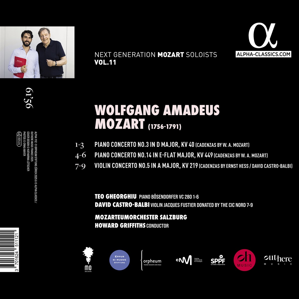 Folge 11 der Reihe „Next Generation Mozart Soloists“ präsentiert das Violinkonzert Nr. 5 in A-Dur sowie die Klavierkonzerte KV 40 und KV 449. Das Klavierkonzert Nr. 3 ist ein sehr frühes Werk, das auf Werke anderer Komponisten zurückgeht, während Nr. 14 1784 von einem voll ausgereiften Mozart geschrieben wurde, der sich von der funktionalen Musik entfernte und seine Ideen in einer dramatischeren Struktur ausdrückte. Was die beiden Werke verbindet, so der schweizerisch-kanadische Pianist Teo Gheorghiu, ist die Tatsache, dass es sich bei beiden um „Konzerte mit überwiegend fröhlichem und optimistischem Ausdruck“ handelt. Der französische Geiger David Castro-Balbi meint, „von Mozarts Violinkonzerten hat Nr. 5 den stärksten Operncharakter“. Begleitet werden die beiden Solisten vom Mozarteumorchester Salzburg unter der Leitung von Howard Griffiths.