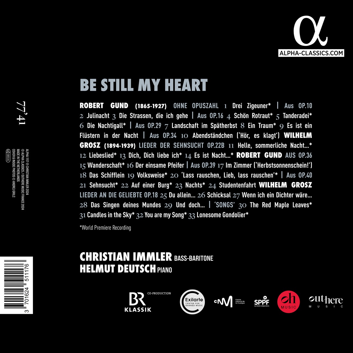 Be Still My Heart präsentiert Werke von zwei wenig bekannten Wiener Komponisten. Der in der Schweiz geborene Robert Gund (1865-1927), ein in Wien hoch angesehener Pianist, Lehrer und Komponist, dessen Werke inzwischen in Vergessenheit geraten sind, und sein jüngerer Kollege Wilhelm Grosz (1894-1939), der zum Zeitpunkt von Gunds Tod in Berlin sehr erfolgreiche Songs für das Kino schrieb. Grosz emigrierte 1934 zunächst nach England, 1939 dann in die Vereinigten Staaten, wo seine Musik sowohl von der Postromantik als auch vom Jazz beeinflusst wurde. Dieses Programm, das von Christian Immler und Helmut Deutsch, beides Meister des deutschen Liedes, konzipiert und aufgeführt wird, enthält viele Lieder, die zum ersten Mal aufgenommen wurden. Die in England und den USA entstandenen Lieder von Grosz haben zahlreiche Coverversionen von Musikgrößen des 20. Jahrhunderts wie Frank Sinatra, Nat King Cole und den Beatles inspiriert.