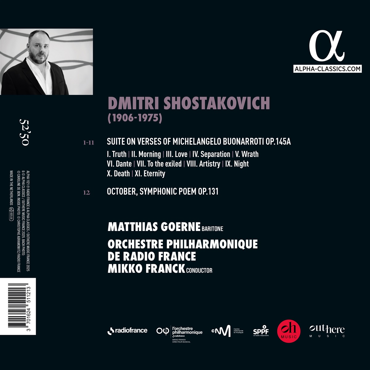 Matthias Goerne, das Orchestre Philharmonique de Radio France und Mikko Franck setzen ihre Reihe mit Aufnahmen von Schostakowitschs symphonischen Werken mit Bariton mit der Suite über Verse von Michelangelo Buonarroti (1974) und der symphonischen Dichtung Oktober (1967) fort. Es handelt sich um zwei sehr unterschiedliche Werke: Das erste ist eines von Schostakowitschs persönlichsten Werken und hat keinen Bezug zu den ideologischen Fragen der Sowjetmacht. Das zweite wurde von den sowjetischen Behörden in Auftrag gegeben, um die Revolution von 1917 zu verherrlichen, und ist voller Ironie. Matthias Goerne ist der perfekte Interpret für Schostakowitschs großen Zyklus mit Vertonungen von Michelangelos Gedichten, in dem sich intime Momente mit kraftvoll-dramatischen Passagen in voller Orchesterstärke abwechseln.