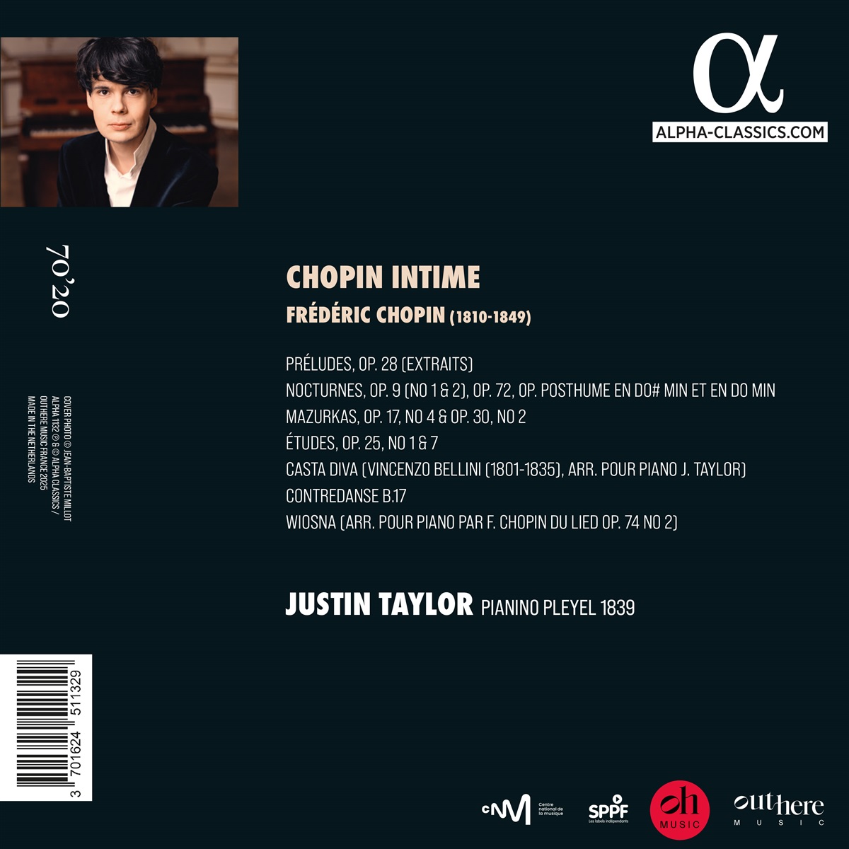 Justin Taylor hat eine Leidenschaft für historische Tasteninstrumente und ist stets bestrebt, die Werke, die er in sein Repertoire aufnimmt, in Einklang mit den am besten geeigneten historischen Instrumenten zu bringen. Von Frédéric Chopins Musik, dessen intime musikalische Welt Justin Taylor hier präsentiert, war er seit jeher fasziniert. Wir wissen, dass Chopin einige seiner Präludien während seines Aufenthalts bei George Sand auf Mallorca komponierte, wo er ein ganz besonderes Instrument benutzte. Es handelte sich um ein Pleyel Pianino - ein kleines aufrechtes Klavier mit sechseinhalb Oktaven, das nur zwischen 1835 und 1842 hergestellt wurde - mit einer schönen natürlichen Resonanz und einem samtigen Timbre. Taylor hat die auf diesem Pleyel-Pianino komponierten Präludien zusammen mit einer Auswahl von Etüden, Nocturnes und Mazurken aufgenommen, die alle perfekt zum Klang des Instruments passen. Er spielt auf einem Pianino, das wenige Monate nach Chopins Instrument gebaut wurde und daher klanglich als ein Geschwisterinstrument bezeichnet werden kann.