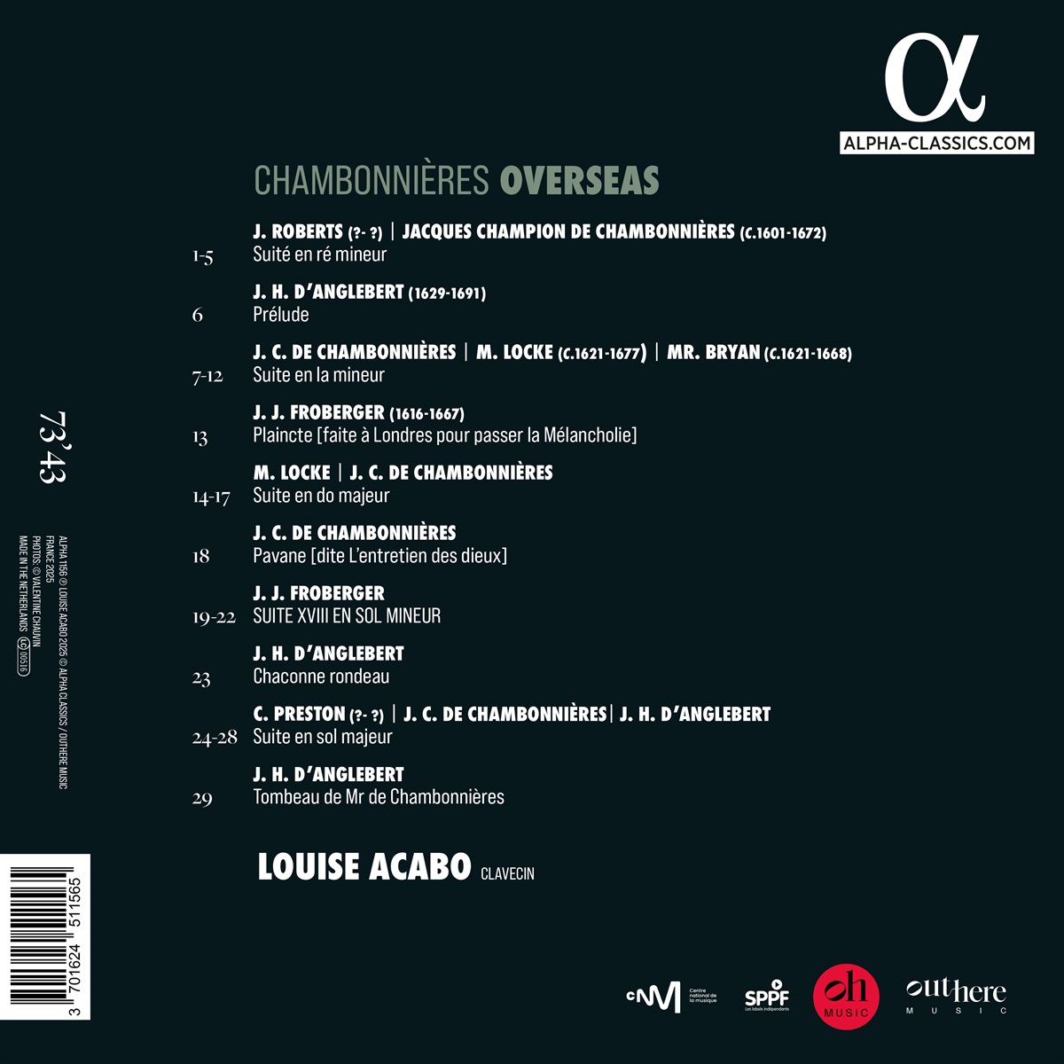 „Wer einmal das Cembalo des Sieur de Chambonnières gehört hat, braucht nichts anderes mehr zu hören“, heißt es in der Harmonie universelle von 1636. Es war diese einzigartige Beziehung zum Klang, die Louise Acabo ansprach: „Seine Musik, die sehr gesanglich ist, verlangt vom Spieler, dass er über den mechanischen Aspekt des Instruments hinausgeht, dass er sich seiner Stärke und Zerbrechlichkeit mit Geschmeidigkeit nähert“. Obwohl Chambonnières Frankreich nie verlassen hat, beeinflusste sein Werk auch Komponisten im Ausland, vor allem in England. Louise Acabo hat für dieses Debüt ihre eigene Liste von Werken aus den verfügbaren Quellen zusammengestellt, wobei sie Werke von Chambonnières mit Kompositionen von Locke, Preston und Bryne kombiniert hat.