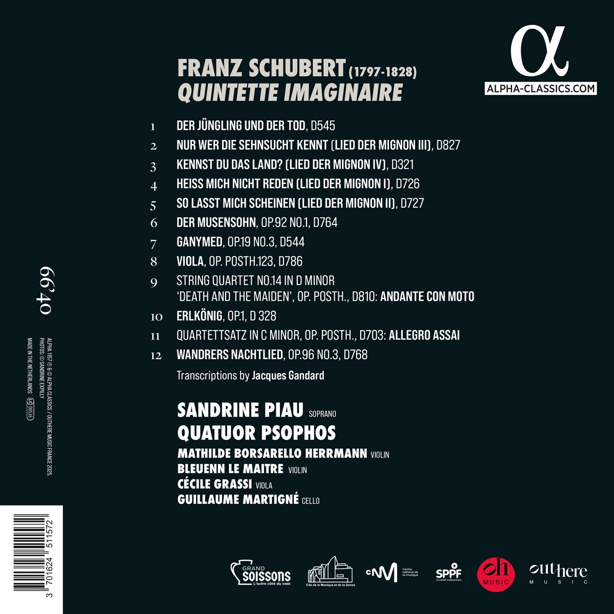 Sandrine Piau war nicht nur von Schuberts Musik, sondern auch von der Gattung des Streichquartetts schon immer fasziniert, wie sie bekennt. „Die unendliche Suche nach der reinen Geste, in der wir uns verlieren, um miteinander eins zu werden, erinnert mich an die Wasserballette in den altmodischen Musicals, in denen die schwimmenden Frauen Bilder von perfekten Blumen formten“. Gemeinsam mit dem Psophos-Quartets präsentiert Sandrine Piau ein großartiges Programm mit Transkriptionen und erfüllt sich damit einen Traum. „Zwischen dem Haar der Bögen und der Textur der Stimme verschmelzen unsere Instrumente zu einem imaginären Schubert-Quintett“.