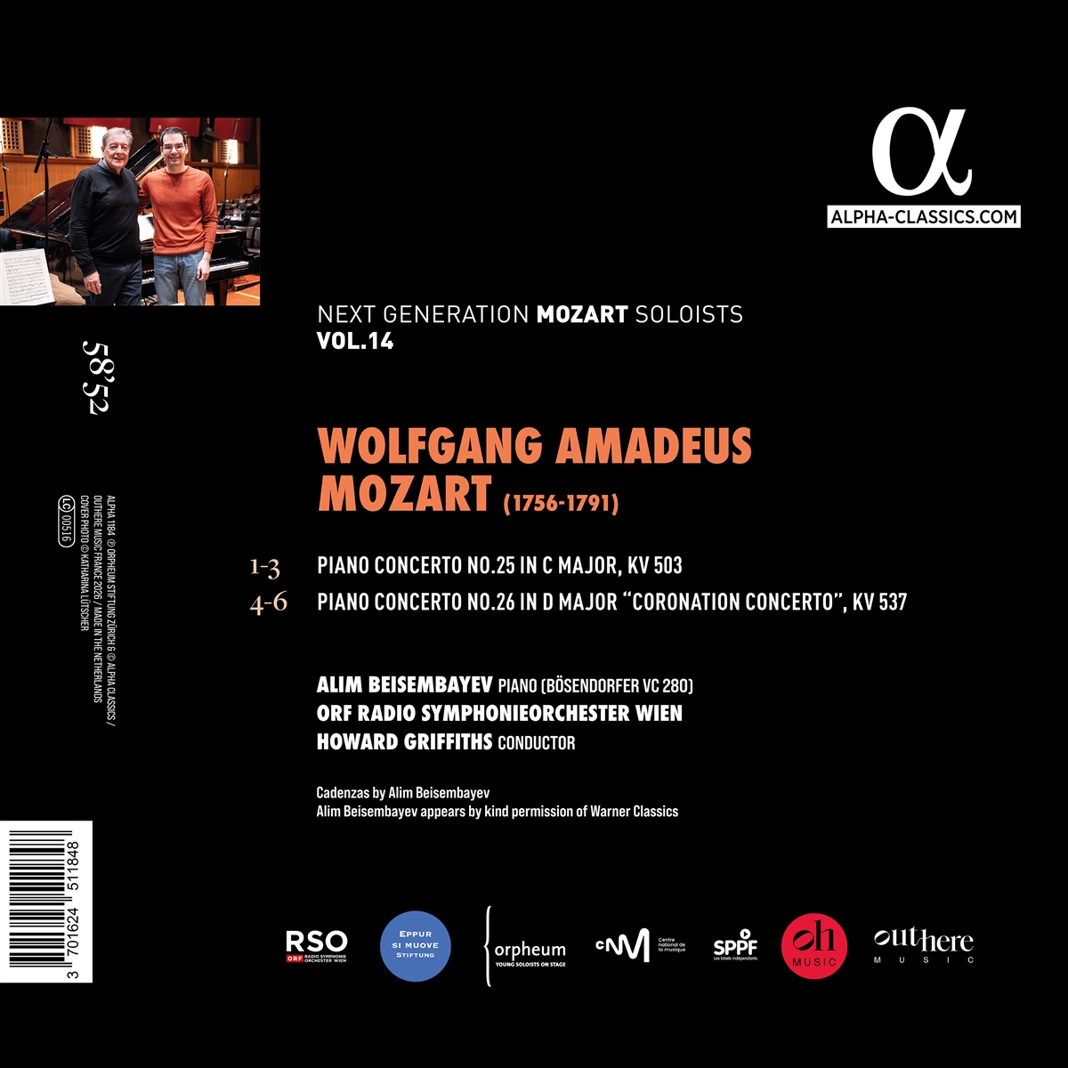 Der kasachische Pianist Alim Beisembayev präsentiert unter der Leitung von Howard Griffiths in Folge 14 der Reihe „Next Generation Mozart Soloists” Mozarts zwei letzte Klavierkonzerte. Zwei Jahre liegen zwischen dem Konzert KV 503 und dem Konzert KV 537, das im Februar 1788 entstand. Es trägt den Beinamen „Krönungskonzert“, weil der Komponist es in Frankfurt zur Krönung von Kaiser Leopold II. spielte: „Beide Werke sind in erster Linie majestätisch, zeigen aber auch Momente der Verspieltheit, Zärtlichkeit und manchmal Nostalgie. Auch opernhafte Passagen sind häufig zu hören", sagt Alim Beisembayev, der sowohl in Russland als auch an der Royal Academy of Music in London studierte. "Lange Zeit dachte ich, seine Musik würde nur von Kindern gespielt ... Vielleicht verstehen wir Mozart am besten als Kinder, bevor wir ein Verlangen nach „Interpretation” verspüren. Ich finde, Mozarts Musik sollte rein und unschuldig klingen.”