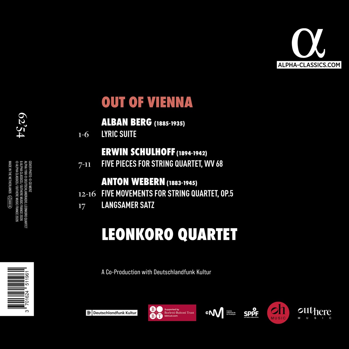 Das Leonkoro Quartett wurde 2019 gegründet und gewann 2022 mehrere renommierte Preise: den Ersten und acht weitere Preise beim internationalen Wigmore Hall Wettbewerb, den Jürgen Ponto Foundation Music Prize und den ersten Preis beim Bordeaux Wettbewerb. Nun nehmen die Quartett-Mitglieder, die auch BBC Radio 3 New Generation Artists waren, mehrere Aufnahmen für Alpha Classics auf. Erste Station: Wien und dessen Einfluss auf die Musiklandschaft des frühen 20. Jahrhunderts. Alban Berg vollendete seine Suite lyrique am 5. Oktober 1926: Diese Suite, die Theatralik und strenge Architektur, freie Atonalität und Dodekaphonie vereint, drückt die leidenschaftliche Liebe des Komponisten zu Hanna Fuchs während dieser Zeit aus. Erwin Schulhoff, 1894 in Prag geboren und 1942 in einem Gefangenenlager in Bayern gestorben, wurde von Dvořák entdeckt und studierte ab seinem 12. Lebensjahr in Wien; Seine Fünf Stücke widmete Schulhoff dem Komponisten Darius Milhaud. Im Opus 5, von Anton Webern, das Glenn Gould als „sinnlichen“ Expressionismus bezeichnet, trauert der Komponist um seine Mutter, die am 7. September 1906 gestorben war.