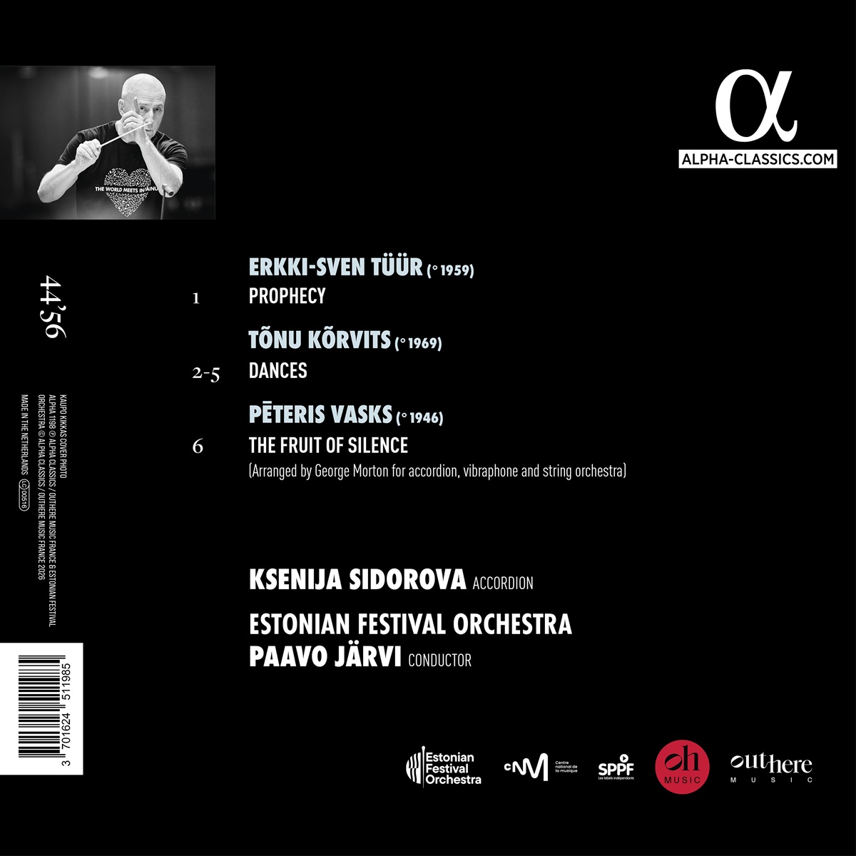 Mit diesen Werken für Akkordeon und Orchester huldigen Ksenija Sidorova und Paavo Järvi der Musik der baltischen Länder: Die Lettin und der Este, die seit über 10 Jahren zusammenarbeiten, haben in Pärnu mit dem von Paavo gegründeten Festivalorchester aufgenommen – einem Luxus-Ensemble aus den besten Musikern der größten europäischen Orchester. Das 2007 komponierte Konzert "Prophecy" von Erkki-Sven Tüür beschäftigt sich mit dem Konzept des Sehers, einer Person, die die Zukunft sehen kann, aber oft von der Gesellschaft verachtet wird, in der sie lebt. Das Konzert nutzt die volle Kraft und Bandbreite des Sinfonieorchesters in völliger Verschmelzung mit der Solistin: „Es ist das technisch komplizierteste Werk, das ich je gespielt habe!“, sagt Ksenija. Das Konzert "Dances" eines weiteren estnischen Komponisten, Tõnu Kõrvits, wurde für Sidorova geschrieben und 2024 in Pärnu uraufgeführt. Der Komponist wollte sich ganz in das Akkordeon vertiefen, um sein Werk zu schreiben, und lernte sogar selbst, es zu spielen… er entlockte dem Instrument einige bislang ungehörte Klänge. "The Fruit of Silence" stammt von Ksenijas Landsmann Pēteris Vasks. Er bearbeitete eines seiner Stücke für Chor und Klavier, das auf Worten von Mutter Teresa basiert.