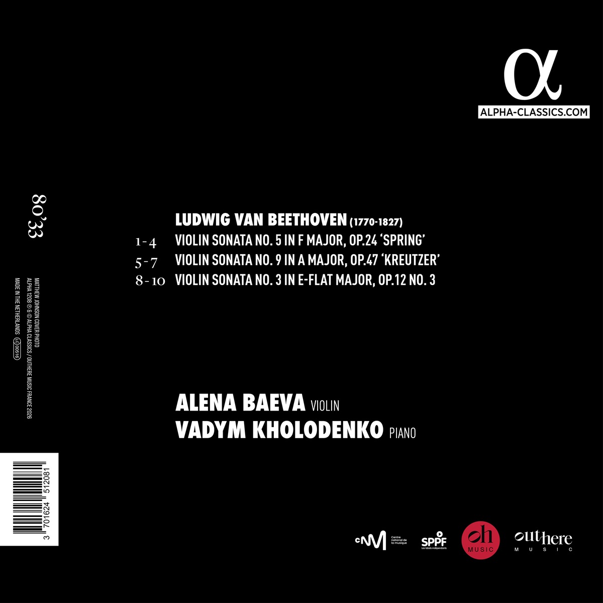 Alena Baeva und Vadym Kholodenko beginnen mit der Einspielung der kompletten Sonaten für Violine und Klavier von Beethoven. Alena gilt als vielseitige Geigerin mit magnetischer Bühnenpräsenz und tritt mittlerweile mit den bedeutendsten Orchestern und Dirigenten auf, während Vadym seit seinem Gewinn der Goldmedaille beim Van Cliburn Wettbewerb 2013 zu den beeindruckendsten Pianisten seiner Generation zählt. Seit mehr als zehn Jahren bilden sie ein eng verbundenes und äußerst gefragtes Duo (auf und neben der Bühne). Die drei auf dieser Aufnahme versammelten Sonaten (Op. 12 Nr. 3, Op. 24 „Frühling“ und Op. 47 „Kreutzer“) entstanden zwischen 1797 und 1803 – eine Phase, in der Beethoven sowohl seine erste große Anerkennung auf europäischen Bühnen erfuhr als auch die ersten Anzeichen seiner Schwerhörigkeit bemerkte... Baeva und Kholodenko arbeiteten mit der Bärenreiter-Ausgabe von 2020 und führten intensive Recherchen zu ihren interpretatorischen Entscheidungen durch: Phrasierung, Verzierungen und Tempi sind das Ergebnis dieser Forschungsarbeit und der zeitgenössischen Quellen.