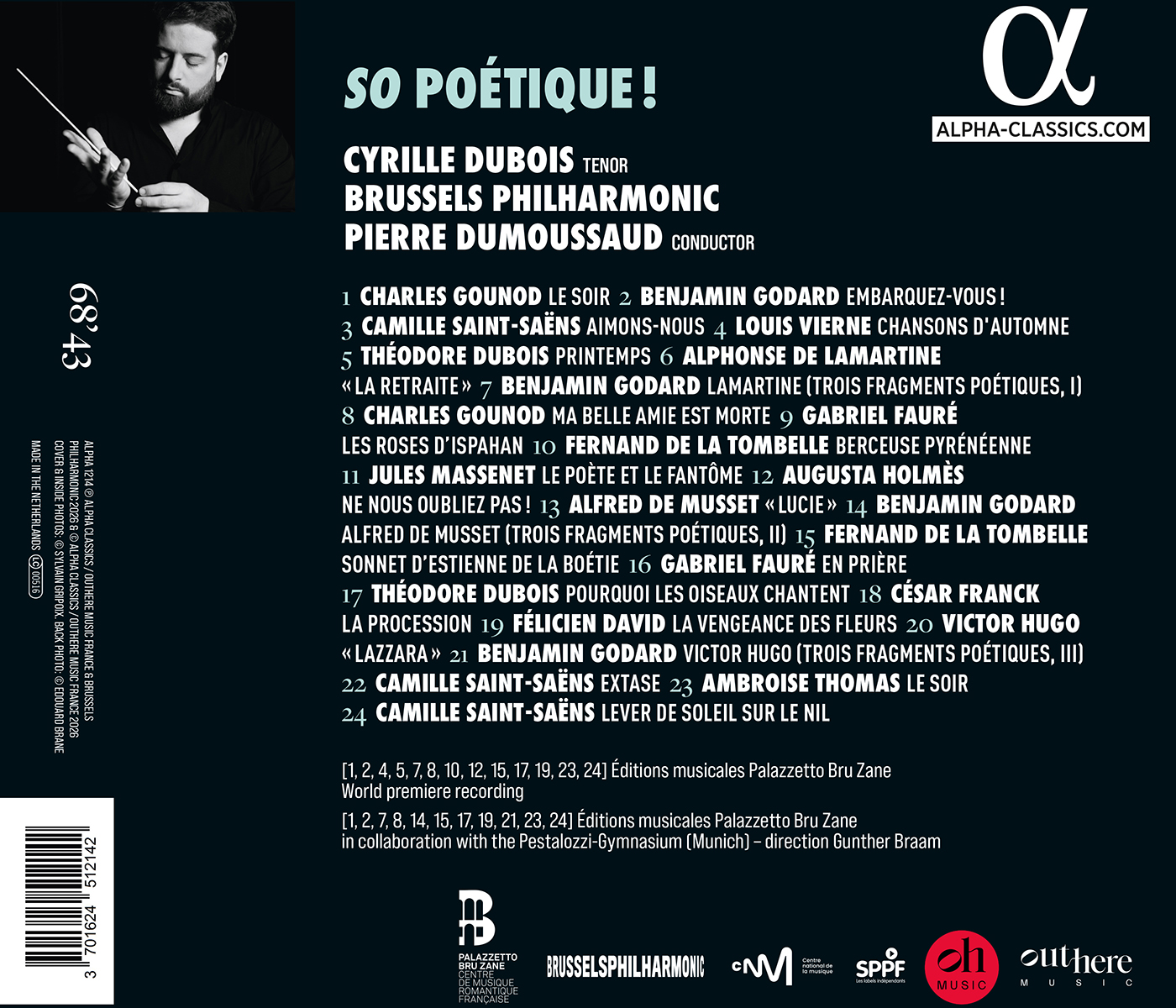 Nachdem sich der Tenor Cyrille Dubois mit dem mehrfach preisgekrönten Album „So Romantique!“ (ALPHA924) weniger bekannte Werke für ténor de grâce aus dem Repertoire der Opéra-Comique erkundet hatte, konzentriert er sich in dieser neuen Aufnahme auf ein einzigartiges Genre: die französische Mélodie mit Orchester. „Da ich mich sehr für die kammermusikalische Dimension der Musik interessiere, fühlte ich mich natürlich zu dieser Form hingezogen, die heute nur noch selten auf dem Programm steht. Die Aufmerksamkeit für die Klangfarbe ist hier von entscheidender Bedeutung, insbesondere bei der Interpretation solch kurzer Stücke, eine Übung, die im Mittelpunkt meines Ansatzes als Mélodiste steht“, sagt Dubois. Dieses von den Forschern und Herausgebern des Palazzetto Bru Zane zusammengestellte Programm ermöglicht es uns, verlorene Schätze des französischen Erbes wiederzuentdecken: Raffinesse, die Kunst der Andeutung, Zartheit, Ausdruckskraft – alles hier ist so poetisch!