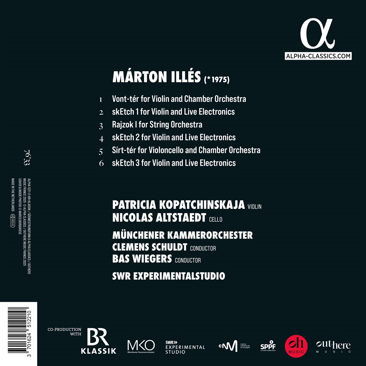 Der 1975 in Budapest geborene und in Deutschland lebende Komponist Márton Illés studierte bei Detlev Müller-Siemens und Wolfgang Rihm. Im Jahr 2020 komponierte er das Violinkonzert „Vont-tér“ für Patricia Kopatchinskaja, eine langjährige Partnerin, die seine Musik mit vollem Einsatz aufführt: „Sie vermittelt den Eindruck, dass Musik greifbar, wirklich dreidimensional sein kann, so dass man sie fast berühren könnte, dass jede Geste ihre eigene Farbe, Temperatur, ihren eigenen Geruch und Geschmack hat“, sagt Illés. „Sírt-tér“, „Raum voller Tränen“, ist ein Cellokonzert: „Ich lasse es jammern, schreien oder sogar hysterisch brüllen, um die stimmlichen Qualitäten hervorzuheben, die menschliches Leid vermitteln können.“ In Nicolas Altstaedt „habe ich den idealen Interpreten gefunden, der das dunkle Drama dieses Themas mit existentieller Intuition erfasst und es mit urwüchsiger Kraft zum Klingen bringt“, so Illés. Seine weitere Komposition „Rajzok I“ besteht darin, die Saiten von 24 Instrumenten auf unterschiedliche Vierteltonintervalle zu stimmen. Eine sehr ungewöhnliche und faszinierende Totalskordatur. In „Three Sketches“ verschmilzt elektronische Musik mit dem Klang der Violine und vervielfacht so die Empfindungen und Klangtexturen. Fasziniert von der menschlichen Psyche und den Prozessen, die im menschlichen Körper ablaufen, entwickelt Illés Musik, die lebt, spricht und atmet.