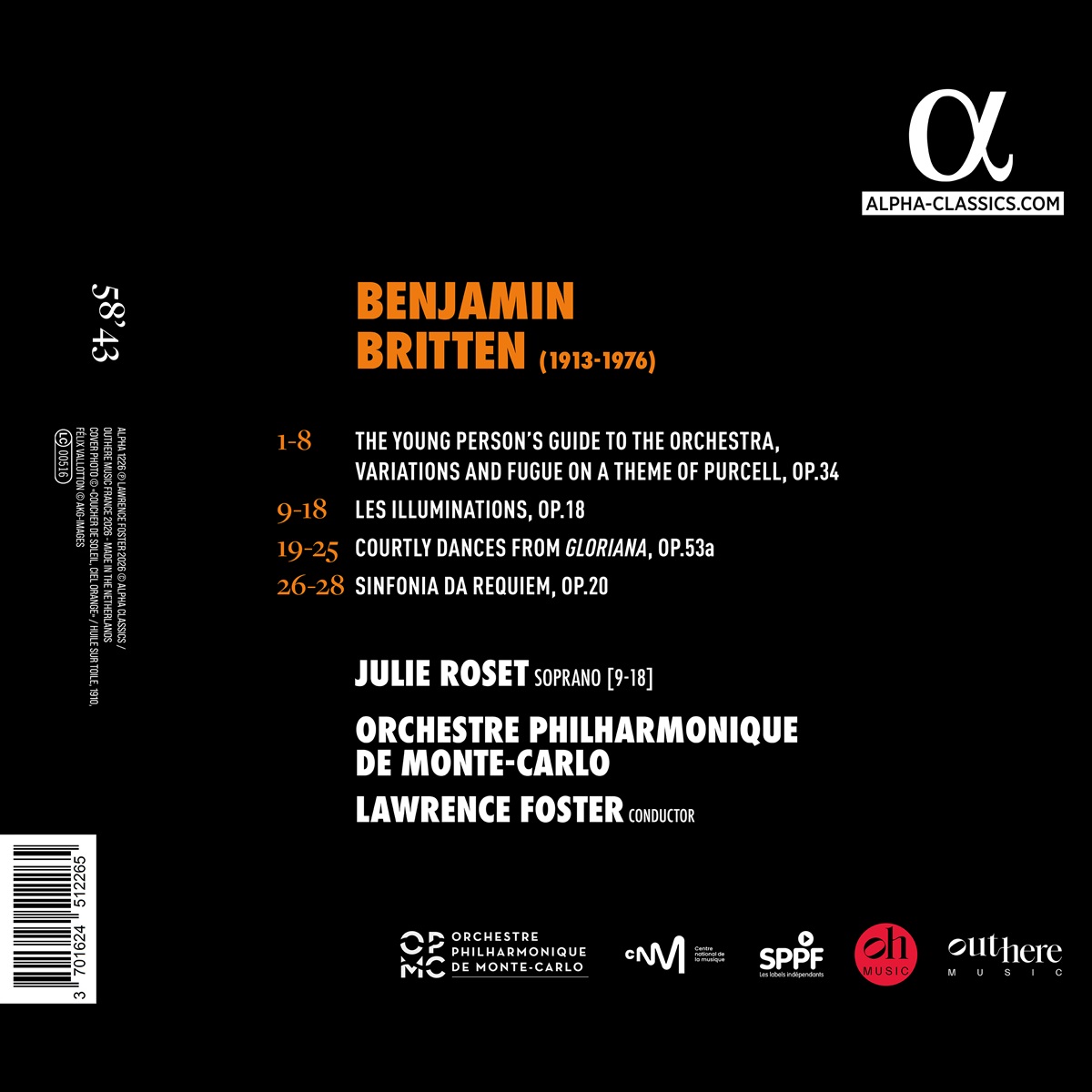 Dieses Album ist eine Hommage an den Komponisten Benjamin Britten, dessen 50. Todestag im Jahr 2026 gewürdigt wird. Es wurde vom Dirigenten Lawrence Foster konzipiert, der zusammen mit dem Philharmonischen Orchester Monte Carlo den vom Postromantizismus geprägten Impressionismus des britischen Komponisten präsentiert. Auf dem Programm steht unter anderem sein Werk "Illuminations", das auf einem Gedicht von Rimbaud basiert und oft von Tenören gesungen wird, ursprünglich jedoch 1940 für Sopran komponiert wurde. Hier ist die junge und bereits sehr erfolgreiche französische Sopranistin Julie Roset als Solistin zu hören, die eine mitreißende Darbietung liefert. Brittens "Young Person's Guide to the Orchestra" wurde 1945 vom britischen Bildungsministerium in Auftrag gegeben und ist eine Reihe von Variationen über ein Thema von Purcell, die jede Instrumentenfamilie im Orchester zur Geltung bringen. Obwohl die "Sinfonia da requiem" (1940) von der japanischen Regierung zur Feier des 2600. Jubiläums der Mikado-Dynastie in Auftrag gegeben wurde, widmete Britten sie dem Andenken seiner Eltern. Die Choral dances aus "Gloriana" schließlich stammen aus der Oper, die der Königin von England gewidmet ist, die sechs Tage vor der Uraufführung, am 2. Juni 1953 gekrönt wurde.