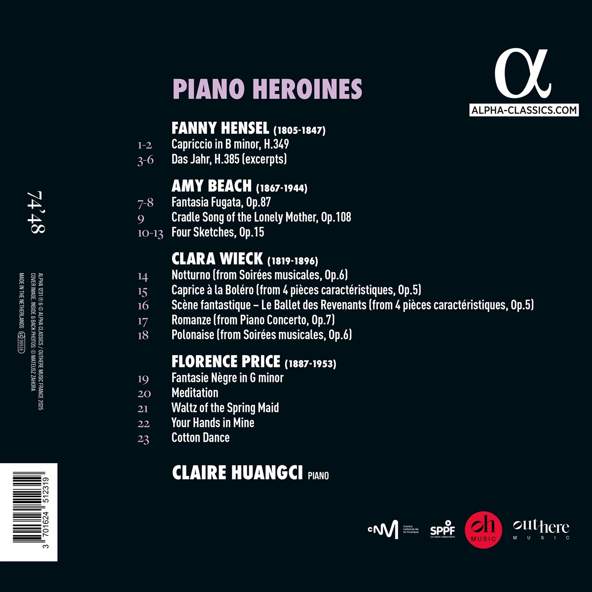 Nach einem Album für Alpha, das ihren amerikanischen Wurzeln gewidmet war (Alpha1071), widmet sich die Pianistin Claire Huangci nun Komponistinnen: „Die Realitäten, mit denen diese Frauen konfrontiert waren, sind für moderne Frauen in diesem Bereich kaum vorstellbar.“ Clara Wieck (die nach ihrer Heirat mit Robert 1840 den Namen Schumann annahm) war Mutter von acht Kindern und Hauptverdienerin der Familie und ständig auf Tournee. Fanny Hensel komponierte größtenteils privat und veröffentlichte oft unter dem Namen ihres Bruders. Amy Beachs Karriere wurde während ihrer Ehe praktisch zum Erliegen gebracht; erst nach dem Tod ihres Mannes kehrte sie auf die Bühne zurück. Florence Price war sowohl rassistischer als auch geschlechtsspezifischer Diskriminierung ausgesetzt und zog später zwei Kinder alleine groß. Über die Jahrhunderte hinweg erreichen uns die Stimmen dieser Frauen dank Musikerinnen wie Claire Huancy: „In ihrer Musik hören wir nicht nur Geschichte. Wir hören Transformation. „Heroines“ ist meine Art, ihnen zuzuhören und ihnen meine Stimme hinzuzufügen.“