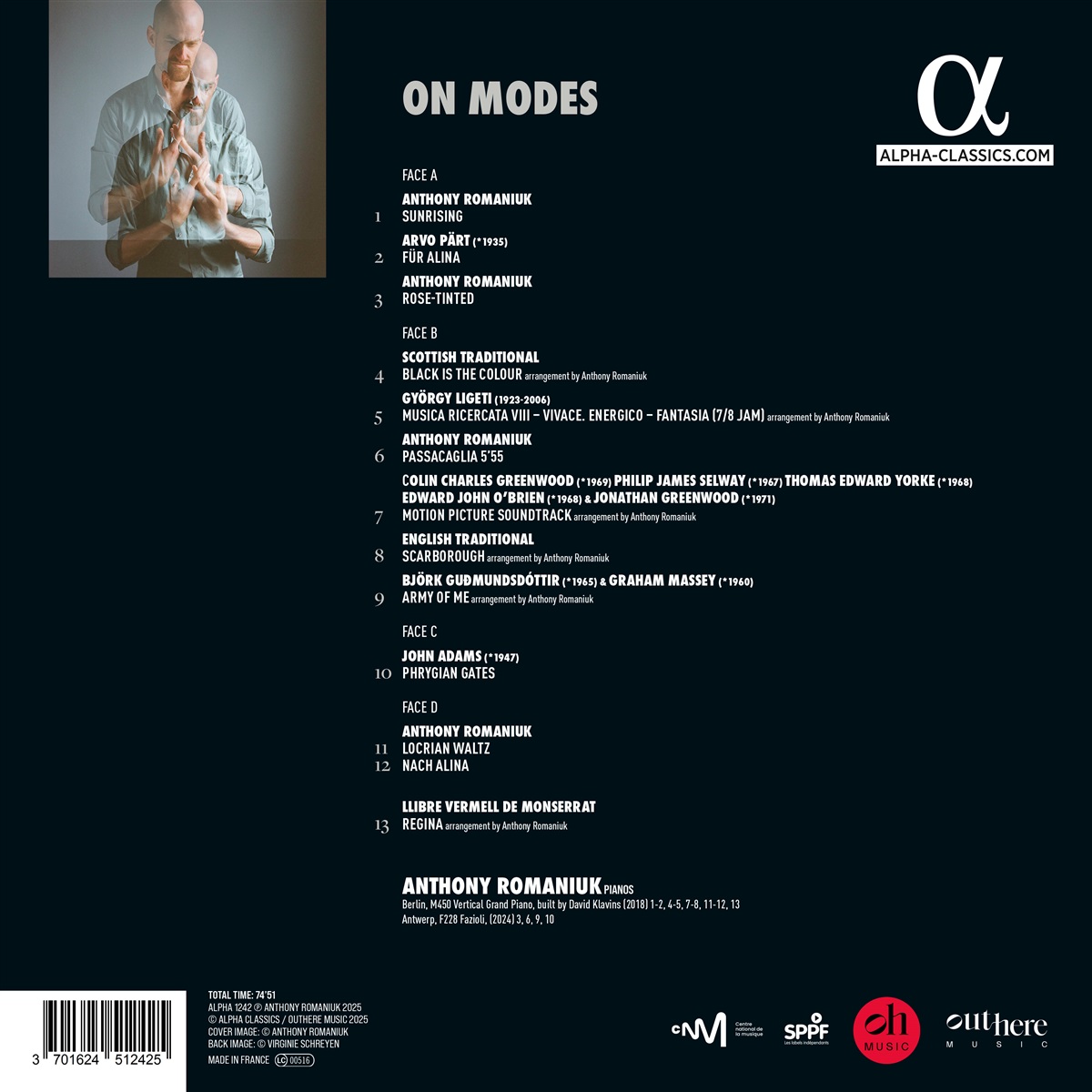 Mit seinem dritten Soloalbum bei Alpha kehrt Anthony Romaniuk, der Alleskönner in Sachen Tasteninstrumente, zum Klavier zurück und widmet sich ganz den sieben Kirchentonarten. Diese leiten sich aus der Durtonleiter ab, bildeten schon die Grundlage der antiken griechischen Musik und sind heute aus Folk, Jazz und vielen anderen Genres nicht mehr wegzudenken – jede Tonart birgt eine eigene Welt voller Charakter und Stimmung. Den Ausgangspunkt bildet John Adams’ Phrygian Gates. Von hier aus hat Romaniuk ein Programm entwickelt, das Stücke von Arvo Pärt, György Ligeti, Radiohead und Björk mit eigenen Kompositionen verbindet, die er mit Bearbeitungen traditioneller katalanischer sowie englisch-schottischen Volkslieden und freier Improvisationen ergänzt. Auf seiner weitergehenden Suche nach einem unverwechselbaren persönlichen Klang setzt er zwei Flügel ein, darunter einen Klavins-Stehflügel aus der Sammlung von Nils Frahm. Dessen riesige Resonanzdecke und bis zu vier Meter langen Basssaiten erzeugen einen überwältigenden, fast körperlich spürbaren Klang. Durch den zusätzlichen Einsatz analoger und digitaler Effekte sowie neuartiger Aufnahmetechniken entsteht eine einzigartige Klanglandschaft, die an eine raumgreifende Klanginstallation erinnert.