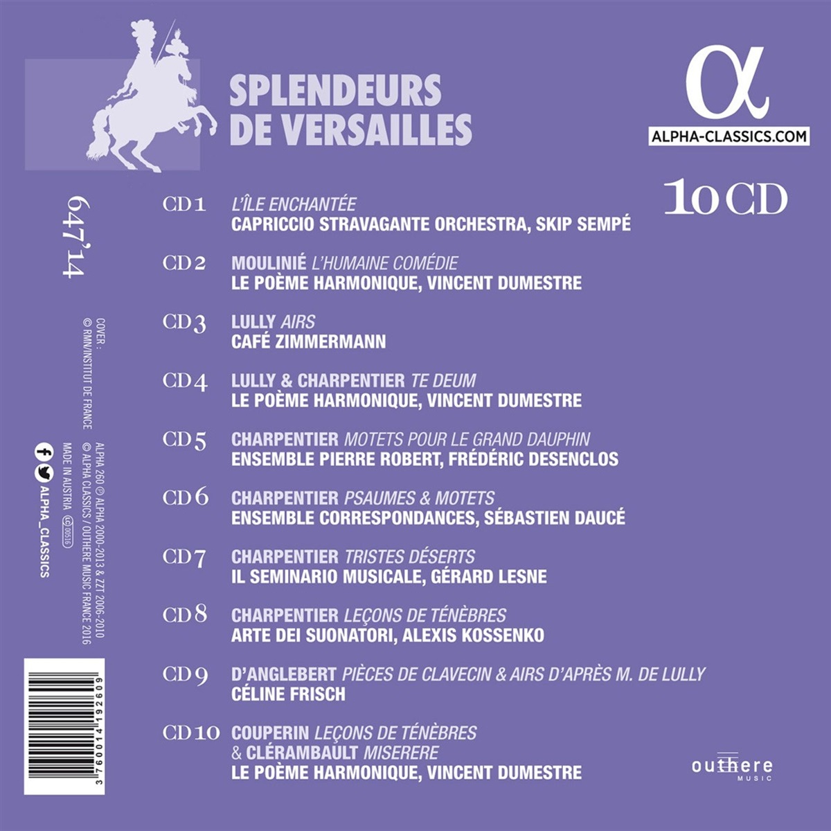 Arnould, Benoit / Arte dei Suonatori / Auvity, Cyril / Bennani, Hasnaa / Bernfeld, Jay / Brahim-Djelloul, Amel / Bucher, Aurore / Café Zimmermann / Capella Cracoviensis / Capriccio Stravagante / Crossley-Mercer, Edwin / Daucé, Sébastien / Desenclos, Frederic / Druet, Isabelle / Dumestre, Vincent / Ensemble Correspondances / Ensemble Pierre Robert / Fortin, Olivier / Frisch, Céline / Kossenko, Alexis / Laurens, Guillemette / Lefilliâtre, Claire / Lesne, Gérard / MacLeod, Stephan / Magouët, Anne / Maurette, Ariane / Mechelen, Reinoud van / Moisio, Jasu / Le Poème Harmonique / Poul, Camille / Il Seminario Musicale / Sempé, Skip / Thompson, Jeffrey