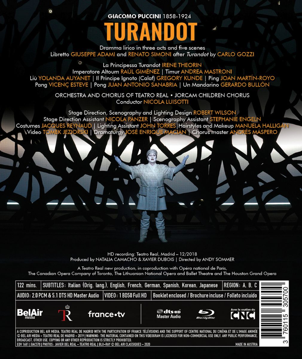 Die letzte Oper Giacomo Puccinis stand auf dem Programm des Teatro Real in Madrid. In einer sensationellen Inszenierung brachte Robert Wilson mit seiner – wie immer – gewaltigen Bild- und Farbsprache dieses Werk auf die Bühne. Er führt die Darsteller mit sicherer Personenregie durch diese dramatische Geschichte über den Sieg der wahren Liebe.