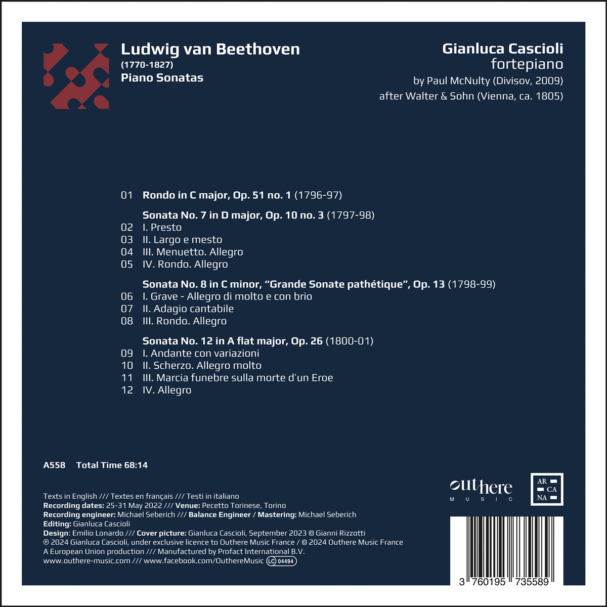 Beethovens Musik stand schon immer im Mittelpunkt von Gianluca Casciolis Interpretationsforschung. Was das vorliegende Projekt auszeichnet, ist vor allem die Wahl des Instruments: ein Hammerflügel nach dem Vorbild eines 1805 von Paul McNulty gebauten Anton Walter. Dieser ist sowohl mit einem Moderator als auch mit einem Una-Corda-Register ausgestattet, genauso wie es Beethoven 1802 bei demselben Konstrukteur in Auftrag gab. Die Aufnahmen widmen sich dann folgerichtig Werken, die zwischen 1796 und 1802 komponiert und veröffentlicht wurden. Das Interesse an historischen Aufführungspraktiken und Originalquellen, das zunehmend zu einem Kennzeichen von Casciolis Aufführungen geworden ist, steht im Zentrum dieser Produktion, in der unter anderem arpeggierte Akkorde, Verzierungen, verzierte Fermaten und die Verwendung von Rubato zu hören sind. Alle Entscheidungen in diesen Bereichen beruhen jedoch immer auf den Quellen, Methoden und Abhandlungen aus Beethovens Zeit, wie der Künstler selbst im Interview in den Liner Notes erklärt.