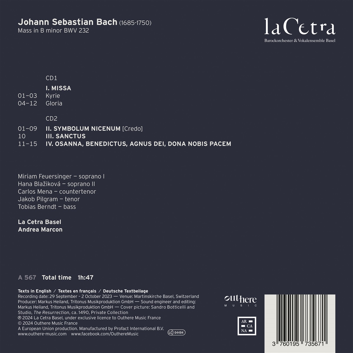 25 Jahre La Cetra Basel! Zur Feier dieses Jubiläums veröffentlichen La Cetra und Arcana das „größte musikalische Meisterwerk aller Zeiten“, wie das Werk im 19. Jahrhundert genannt wurde: Bachs h-Moll-Messe. „Es ist ein wahrgewordener Traum, dieses Werk zum 25-jährigen Jubiläum von La Cetra aufgenommen zu haben - das beste Geburtstagsgeschenk aller Zeiten“, sagt Maestro Andrea Marcon. Unter seiner Leitung hat sich La Cetra Basel in den letzten Jahren mit umjubelten Interpretationen der wichtigsten geistlichen Werke von J. S. Bach einen Namen gemacht. Die vorliegende Einspielung mit hochkarätigen Solisten präsentiert Andrea Marcons besondere Vision für diese Messe, die sich durch die Aufteilung der Stimmen in „Concertisten“ und „Ripienisten“ auszeichnet. Die Klangfülle und der Charakter eines jeden Satzes ergeben sich aus dem gekonnten Gleichgewicht zwischen Soli und Tutti, das einen dreidimensionalen Klang erzeugt, der an eine dreimanualige Orgel erinnert. Das Ergebnis ist ein einzigartiger Klang voller frischer Nuancen und Farben, der zweifellos sehr nahe an Bachs Vorstellungen heranreicht.