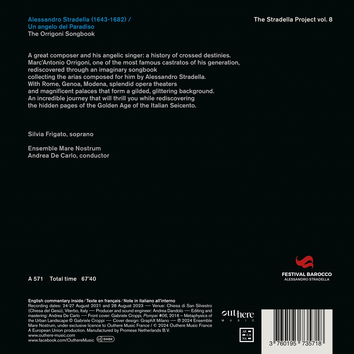 Ein großer Komponist und sein engelsgleicher Sänger: eine Geschichte von sich begegnenden Schicksalen. Marc'Antonio Orrigoni, einer der berühmtesten Kastraten seiner Generation, wird durch ein imaginäres Liederbuch, das die von Alessandro Stradella für ihn komponierten Arien enthält, wiederentdeckt. Man weiß, dass der italienische Violinist, Sänger und Komponist Stradella (*1643) in vielen seiner Opern speziell Stücke für Orrigoni schrieb. Diese sind hier zusammengestellt und werden von der Sopranistin Silvia Frigato, einer Spezialistin für Barockmusik, vorgetragen. Dirigent Andrea De Carlo gründete und leitet das Ensemble Mare Nostrum, das sich schon länger mit Alessandro Stradella befasst und bereits zahlreiche wichtige Preise erhielt, beispielsweise den Preis der deutschen Schallplattenkritik und einen Diapason.