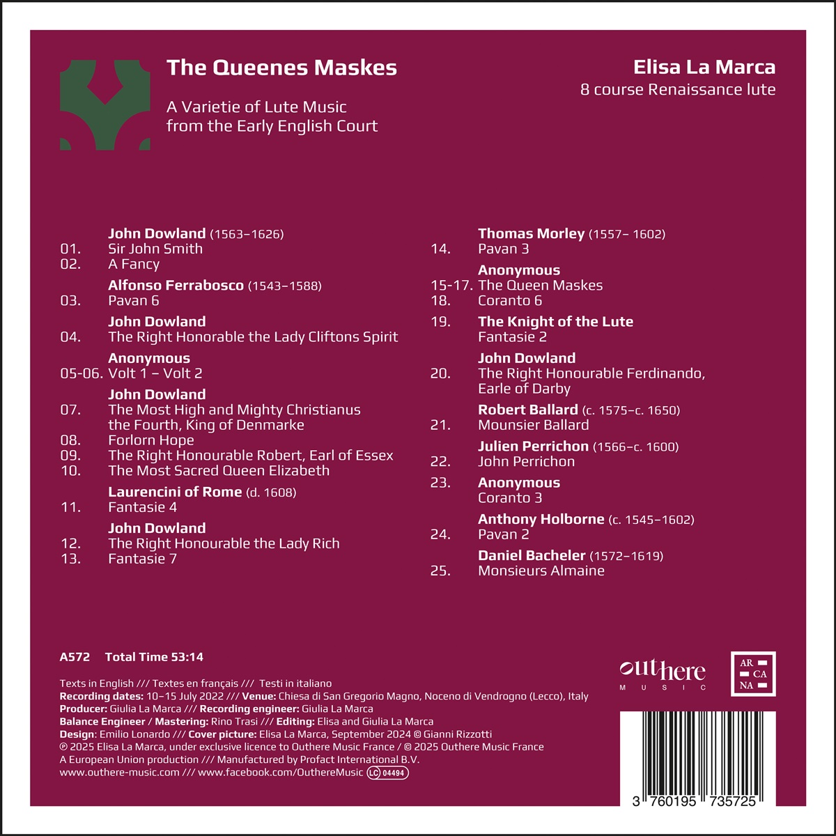 Während seines gesamten Goldenen Zeitalters pflegte England die sog. „Masque“, eine anspruchsvolle Darbietung, die Dialoge, Gesang und Tanz beinhaltete. Im Rahmen dieser Spektakel traten oft Höflinge, manchmal sogar die Königin selbst, auf der Tanzfläche auf. Für das musikalische Herzstück dieser Produktionen sorgten jedoch engagierte Profis. Lautenisten waren besonders geschickt darin, Musik für jeden Anlass zu kreieren. Die Tänze, Variationen über populäre Lieder und Fantasien, die sie komponierten, sind von großer Vielfalt und Virtuosität. Die vorliegende Aufnahme enthält Lautenwerke der bedeutendsten Komponisten der elisabethanisch-jakobinischen Ära, mit Musik von Dowland, Holborne, Bacheler, Ferrabosco und anderen Zeitgenossen, die an The Queenes Maskes beteiligt waren. Seit vielen Jahren wird Elisa La Marca von führenden Spezialensembles (Il Giardino Armonico, Il Pomo d'Oro, Les Musiciens du Prince, Zefiro usw.) geschätzt, mit denen sie an prestigeträchtigen Orten auftritt, zuletzt am Teatro alla Scala in Mailand. Hier präsentiert sie ihr erstes Soloalbum, das ein Lieblingsrepertoire der Künstlerin in den Fokus stellt.