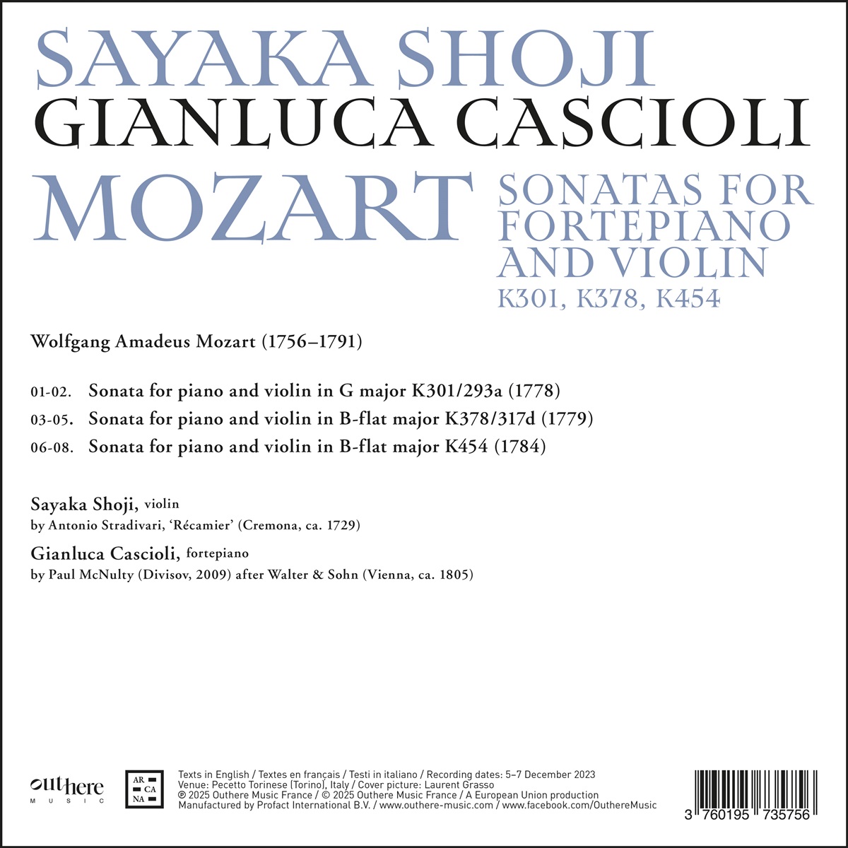 Die Geigerin Sayaka Shoji und der Pianist Gianluca Cascioli, die seit über 15 Jahren eine musikalische Partnerschaft pflegen und in der ganzen Welt konzertieren, haben sich einer „historisch informierten“ Sichtweise zugewandt, die durch lange Studien und wichtige Kooperationen gereift ist. Mit dieser Erfahrung gehen sie nun die Mozart-Sonaten mit einem Ansatz an, der mit der Wahl ihrer Instrumente beginnt: die außergewöhnliche Stradivari 'Récamier' mit Darmsaiten und ein Paul McNulty-Fortepiano (Kopie von Anton Walter), das Cascioli bereits bei seinem jüngsten Beethoven-Recital verwendet hat. Diese Veröffentlichung, die den Auftakt zu einem vier Alben umfassenden Zyklus bildet, markiert den Beginn von Shojis Zusammenarbeit mit dem Label Arcana.