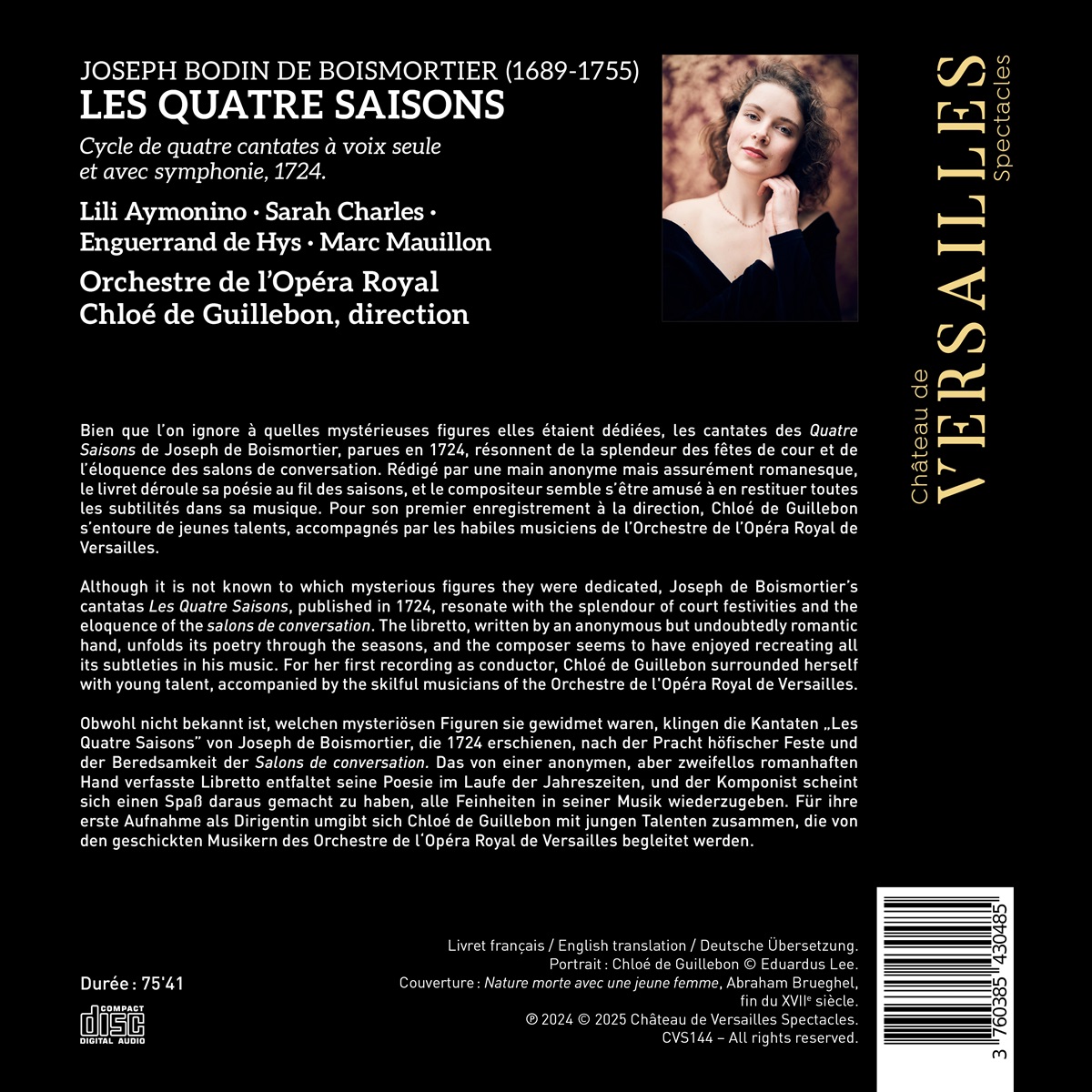 Obwohl nicht bekannt ist, welchen geheimnisvollen Gestalten sie gewidmet waren, klingen die 1724 veröffentlichten Kantaten „Les Quatre Saisons“ von Joseph de Boismortier nach dem Glanz der höfischen Feste und der Eloquenz der Salons de Conversation. Das Libretto, das von einer anonymen, aber zweifellos romantischen Hand geschrieben wurde, entfaltet seine Poesie im Laufe der Jahreszeiten, und der Komponist scheint es genossen zu haben, all ihre Feinheiten in seiner Musik wiederzugeben. Für ihre erste Einspielung als Dirigentin hat sich Chloé de Guillebon mit jungen Talenten umgeben, die von den versierten Musikern des Orchestre de l'Opéra Royal de Versailles begleitet werden.