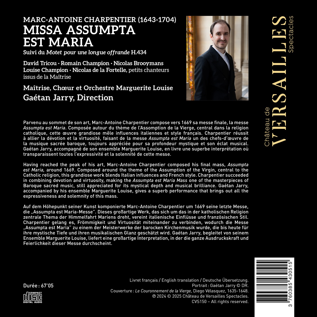 Auf dem Höhepunkt seiner Laufbahn komponierte Marc-Antoine Charpentier um 1669 seine letzte Messe "Assumpta est Maria". Dieses grandiose Werk, das die Himmelfahrt der Jungfrau Maria als ein zentrales Thema der katholischen Religion behandelt, verbindet italienische Einflüsse mit dem französischen Stil. Charpentier gelang es, Frömmigkeit und Virtuosität miteinander in Einklang zu bringen, so dass die Messe zu einem der Meisterwerke der barocken Kirchenmusik wurde, das noch heute wegen seiner mystischen Tiefe und musikalischen Brillanz geschätzt wird. Gaétan Jarry, der von seinem Ensemble Marguerite Louise begleitet wird, liefert eine Interpretation, in der die ganze Ausdruckskraft und Feierlichkeit dieser Messe zur Geltung kommt.