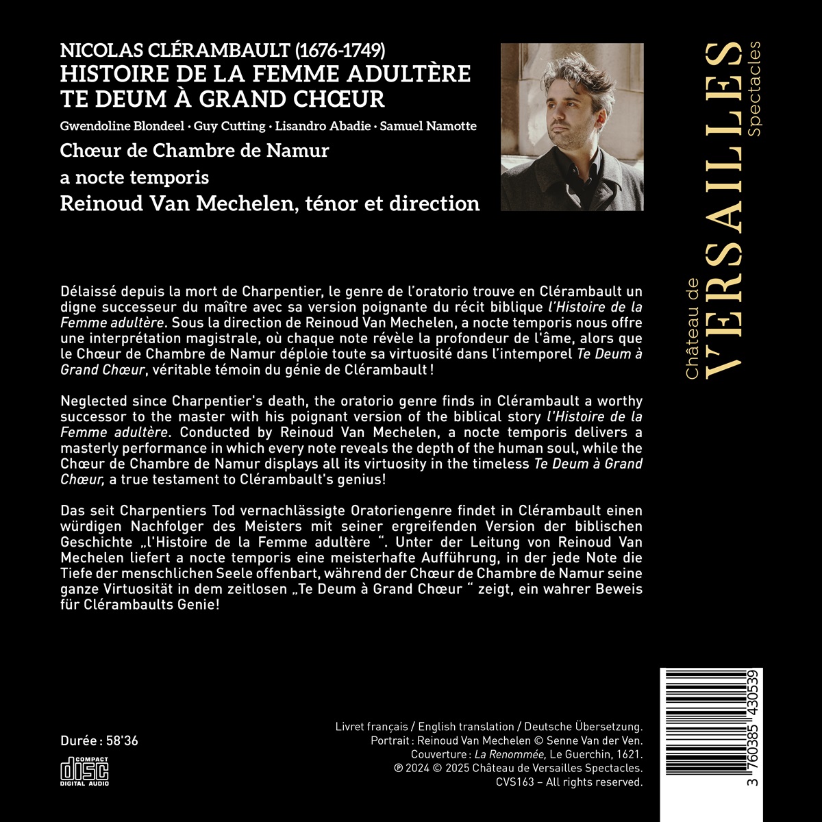 Seit Marc-Antoine Charpentiers Tod vernachlässigt, erfuhr die Gattung des Oratoriums durch Louis-Nicolas Clérambault, einem würdigen Nachfolger des Altmeisters, eine Wiederbelebung. Unter der Leitung von Reinoud Van Mechelen liefert a nocte temporis eine meisterhafte Aufführung von Clérambaults ergreifender Version der biblischen Geschichte "l'Histoire de la Femme adultère" (Jesus und die Ehebrecherin). Jeder Ton offenbart die Tiefe der menschlichen Seele. Der Chœur de Chambre de Namur zeigt des Weiteren auf diesem Album seine Virtuosität in dem zeitlosen Te Deum à Grand Chœur unter der Leitung von Reinoud Van Mechelen.