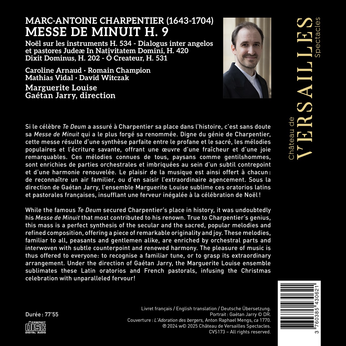 Während das berühmte „Te Deum" dem Komponisten Marc-Antoine Charpentier einen Platz in der Musikgeschichte sicherte, war es zweifellos seine „Messe de Minuit", die am meisten zu seinem Ruhm beitrug. Getreu Charpentiers Genie ist diese Messe eine vollkommene Synthese aus Weltlichem und Geistlichem, aus volkstümlichen Melodien und raffinierter Komposition – ein Werk von bemerkenswerter Originalität. Diese Melodien, die allen vertraut waren – Bauern wie Edelleuten –, werden durch Orchesterparts bereichert und mit feinem Kontrapunkt und erneuerter Harmonik kunstvoll verwoben. So wird das musikalische Vergnügen allen zugänglich gemacht: sei es durch das Wiedererkennen einer bekannten Weise oder durch das Staunen über ihre außergewöhnliche Bearbeitung. Unter der Leitung von Gaétan Jarry veredelt das Ensemble Marguerite Louise diese lateinischen Oratorien und französischen Pastoralen und verleiht der Weihnachtsfeier eine unvergleichliche Innigkeit!