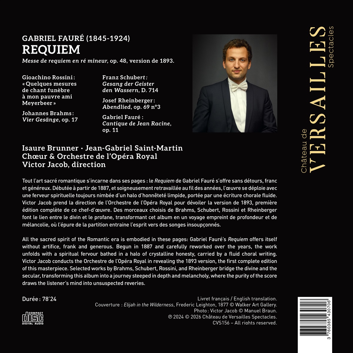 Gabriel Faurés Requiem kommt ohne jede Künstlichkeit daher – offen und großzügig. 1887 begonnen und über Jahre hinweg sorgfältig überarbeitet, entfaltet sich das Werk mit einer spirituellen Inbrunst, eingebettet in einen glasklaren, ehrlichen Klang und getragen von einer fließenden Choralführung. Victor Jacob dirigiert das Orchestre de l’Opéra Royal und lässt die Fassung von 1893 erklingen – die erste vollständige Ausgabe dieses Meisterwerks. Ausgewählte Werke von Brahms, Schubert, Rossini und Rheinberger schlagen eine Brücke zwischen dem Göttlichen und dem Weltlichen und machen dieses Album zu einem Erlebnis voller Tiefe und Melancholie.