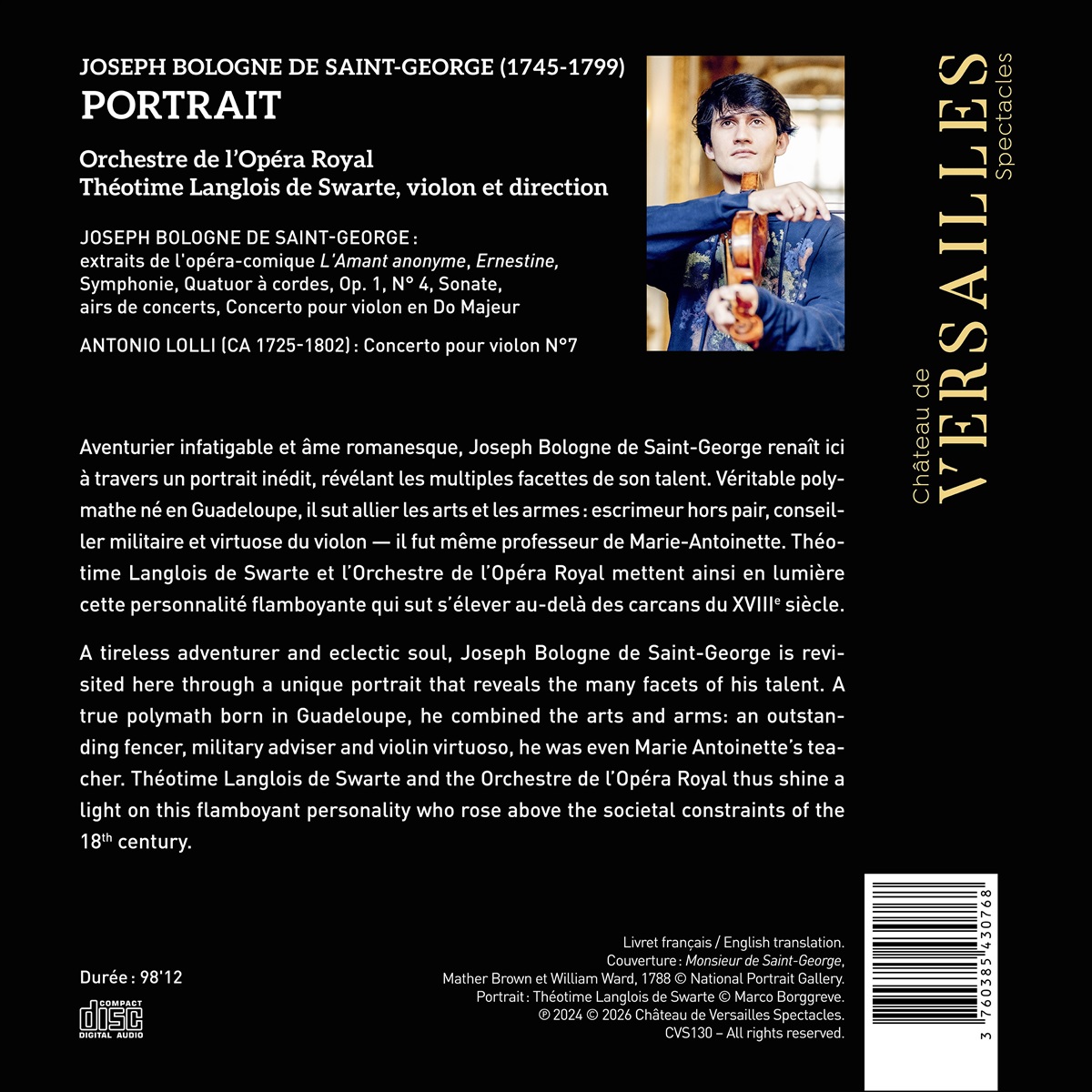Joseph Bologne de Saint-George, ein unermüdlicher Abenteurer und vielseitiger Geist, wird hier anhand eines einzigartigen Porträts, das die vielen Facetten seines Talents offenbart, neu beleuchtet. Der in Guadeloupe geborene Universalgelehrte kombinierte die Kunst des Musizierens mit der Kunst der Kriegsführung: Er war ein hervorragender Fechter, Militärberater und Geigenvirtuose, und er unterrichtete sogar Marie Antoinette. Théotime Langlois de Swarte und das Orchestre de l’Opéra Royal beleuchten diese schillernde Persönlichkeit, die sich über die gesellschaftlichen Zwänge des 18. Jahrhunderts hinwegsetzte.