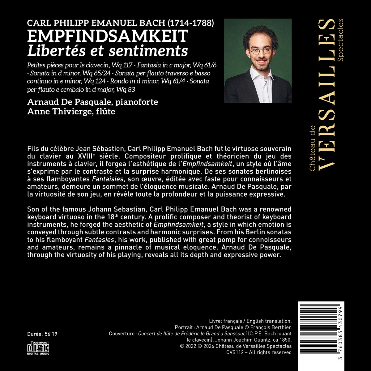 Carl Philipp Emanuel Bach, Sohn des berühmten Johann Sebastian, zählte im 18. Jahrhundert zu den gefeiertsten Tasteninstrumentalisten seiner Zeit. Als überaus produktiver Komponist und Theoretiker prägte er den sogenannten Stil der Empfindsamkeit – eine Musik, die Gefühle durch feine Kontraste und überraschende harmonische Wendungen zum Ausdruck bringt. Von den Berliner Sonaten bis zu seinen sprühenden Fantasien: sein Werk, das damals sowohl für Kenner als auch für Liebhaber mit großem Aufwand gedruckt wurde, gilt bis heute als Höhepunkt musikalischer Ausdruckskraft. Arnaud De Pasquale lässt mit seiner virtuosen Spielkunst die ganze Tiefe und Ausdruckskraft dieser Musik lebendig werden.