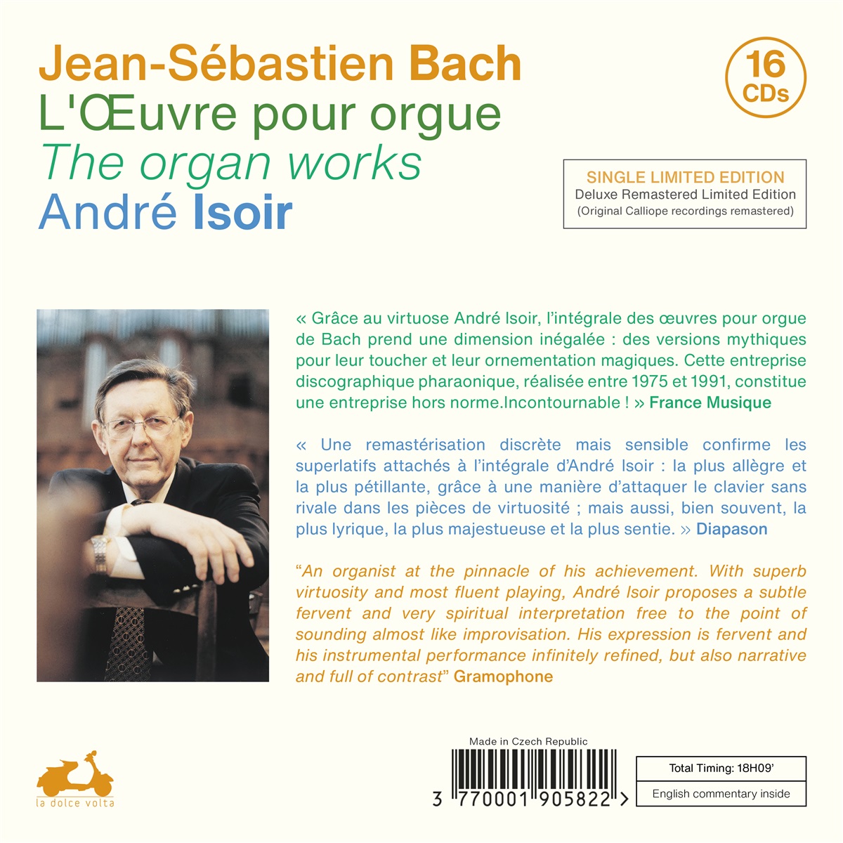 Ein Organist auf dem Höhepunkt seines Könnens: Mit großartiger Virtuosität und fließendem Spiel bietet André Isoir eine subtile und sehr spirituelle Interpretation sämtlicher Orgelwerke Johann Sebastian Bachs, die fast wie eine Improvisation klingt. Sein Ausdruck ist inbrünstig und sein Instrumentalspiel unendlich raffiniert, aber auch erzählerisch und kontrastreich.