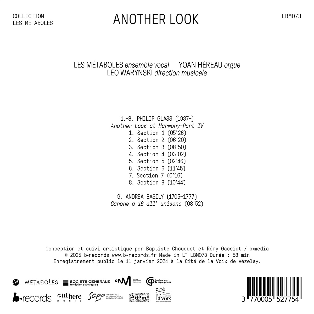 Der Dirigent Léo Warynski und das Vokalensemble Les Métaboles präsentieren auf dieser neuen b-records-Produktion zwei wenig bekannte Chorwerke zweier Komponisten, die in völlig verschiedenen Jahrhunderten gelegt haben. Dem visuell leuchtenden Werk „Another Look at Harmony - Part IV" von Philp Glass steht ein Kanon für 16 Stimmen des unbekannten Barock-Meisters Andrea Basili (1705-1775) gegenüber. Dieses bislang nie aufgeführte Stück harmoniert mit dem Minimalismus von Philip Glass durch seine nahezu perfekte zyklische Musik, die sich fast magisch dreht und scheinbar nicht aufhören kann.