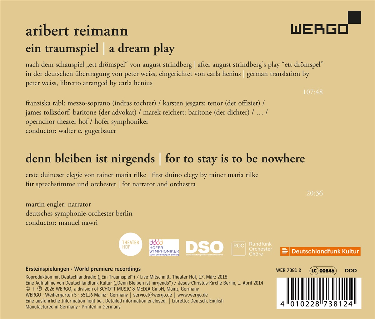 „Ein Traumspiel“ – Aribert Reimanns erste Oper – liegt nun endlich mit diesem Album vor, in der von der Kritik und dem Opernpublikum nachdrücklich gefeierten Inszenierung des Hofer Theaters. So groß die Bedeutung der Vokalmusik in Aribert Reimanns Schaffen ist, so zentral ist für den Komponisten die Rolle der Literatur als Impulsgeber und Inspirationsquelle, Sprachmaterial, Reibungsfläche und Gegenstand musikalischer Anverwandlung: Komponieren für die Stimme ist im breiten Spektrum des Reimann'schen Werks vom unbegleiteten Solostück bis hin zur Oper nahezu immer auch Vertonung literarischer Texte. Das bildgewaltige ‚Traumspiel’ fesselt vom ersten Ton an mit seiner melodischen Vielfalt und Intensität. Aribert Reimann gelingt es, das Grundthema des zugrundeliegenden Schauspiels von August Strindberg sinnlich erlebbar zu machen, das Mitgefühl, und gibt Indras Tochter am Ende ein mit meisterhafter Musik verschnürtes Geschenkpaket aus menschlichen Sorgen, Leiden und Beschwerden mit ins Jenseits zu Gott Indra. Neben August Strindberg inspirierten Reimann auch die Dichtungen von Rainer Maria Rilke, mit dessen erster „Duineser Elegie“ er jedoch musikalisch ganz anders umgeht: In seiner Komposition ‚Denn Bleiben ist nirgends’ verbindet er den von einer Sprechstimme vorgetragenen Text mit einem flächig gesetzten Sinfonieorchester zu einem Melodram. Hierbei korrespondiert die Musik mit einem Text, der, so Reimann im Werkkommentar, ‚neben sich die Entwicklung eines Stückes selbstständiger Musik rechtfertig und der nicht nur Ausgangspunkt für eine musikalische Untermalung ist.’ Zu hören sind Franziska Rabl (Mezzosopran), Karsten Jesgarz (Tenor), James Tolksdorf (Baritont) und Marek Reichert (Bariton), der Opernchor des Theaters Hof und die Hofer Symphoniker unter der Leitung von Walter E. Gugerbauer sowie das Deutsche Symphonie-Orchester Berlin, dirigiert von Manuel Nawri und Martin Engler als Sprecher.