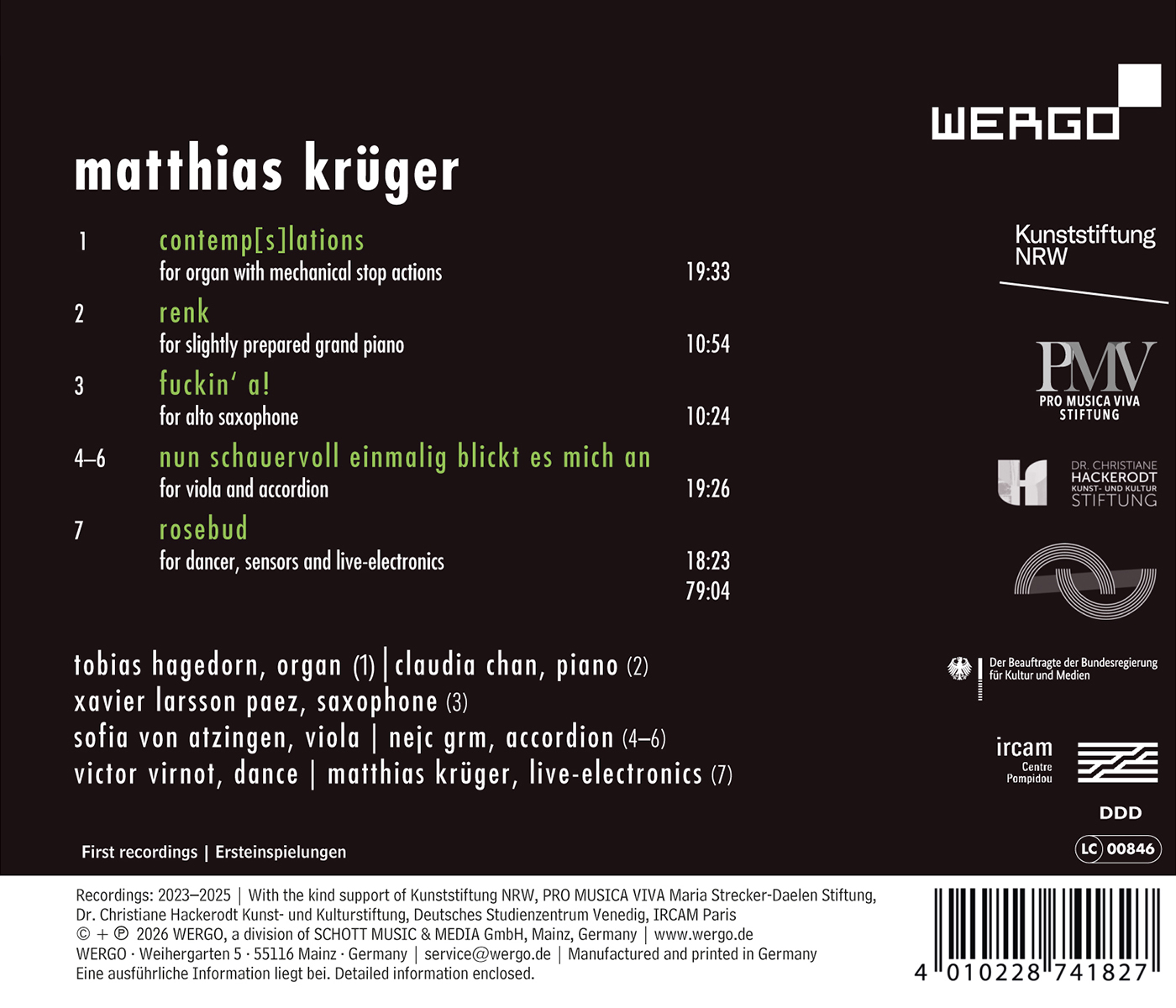 Matthias Krügers Musik tritt als Instrumentalkomposition unterschiedlichster Besetzung und Bauart ebenso in Erscheinung wie als multisensorische Gemengelage aus Klang, Bild und Bewegung oder als reine Elektronik oder … – eine ästhetische Bandbreite, die das Programm dieses Albums ausschnitthaft widerspiegelt. Dennoch gibt es wesentliche Konstanten in Krügers Werken: Eine davon ist die Körperlichkeit ihrer Sprachformen und damit eine enge Bindung an die Gestaltungskraft ihrer Akteure. Klänge werden erforscht und neubestimmt, Physiognomien und Zusammenhänge erkundet. Das frühe Orgelstück „conTemp[s]lations“ scheint zunächst aus dem Rahmen zu fallen, weist jedoch bereits in seiner raumgreifenden Mikrotonalität und unkonventionellen Farbigkeit auf spätere elektronische Stücke wie „rosebud“ hin. Alles in diesem kontemplativen Klangkontinuum ist auf fließende Transformationen der Tonqualitäten und klangfarblichen Mischungsverhältnisse aus. Dagegen sind die instrumentalen Monologe und Dialoge von „fuckin’ A!“, „renk“ und „nun schauervoll einmalig blickt es mich an“ von hoher Ereignisdichte und Bewegungsenergie geprägt. „rosebud“, ein Stück für Tänzer, Sensoren und LiveElektronik entstand am renommierten Pariser IRCAM in Zusammenarbeit mit dem Tänzer Victor Virnot, dessen Choreografie eng mit den live-elektronischen Prozessen verknüpft ist. Beide Ebenen haben sich im Entstehungsprozess gegenseitig beeinflusst, ja geradezu bedingt, bis „rosebud“ zu seiner endgültigen, verbindlichen Form fand. Der Tänzer verkörpert einen „erweiterten“ Musiker – ein Mischwesen aus Mensch und Maschine.