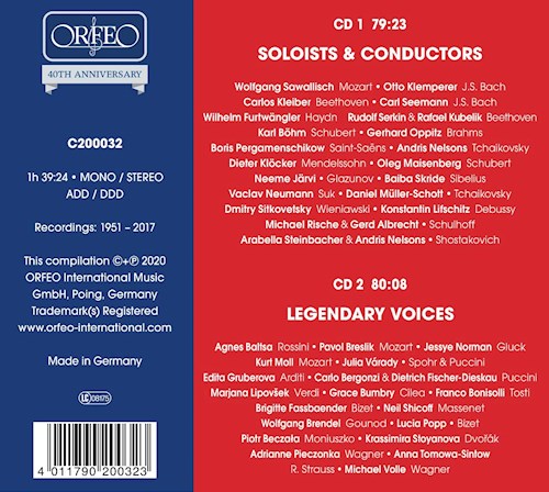Die vorliegende ORFEO-40th-Anniversary-Doppel-CD spiegelt diese beiden Seiten des Labels wieder, indem sie eine Auswahl an Tracks der besten historischen Aufnahmen gemeinsam mit aktuellen Weltstars präsentiert.