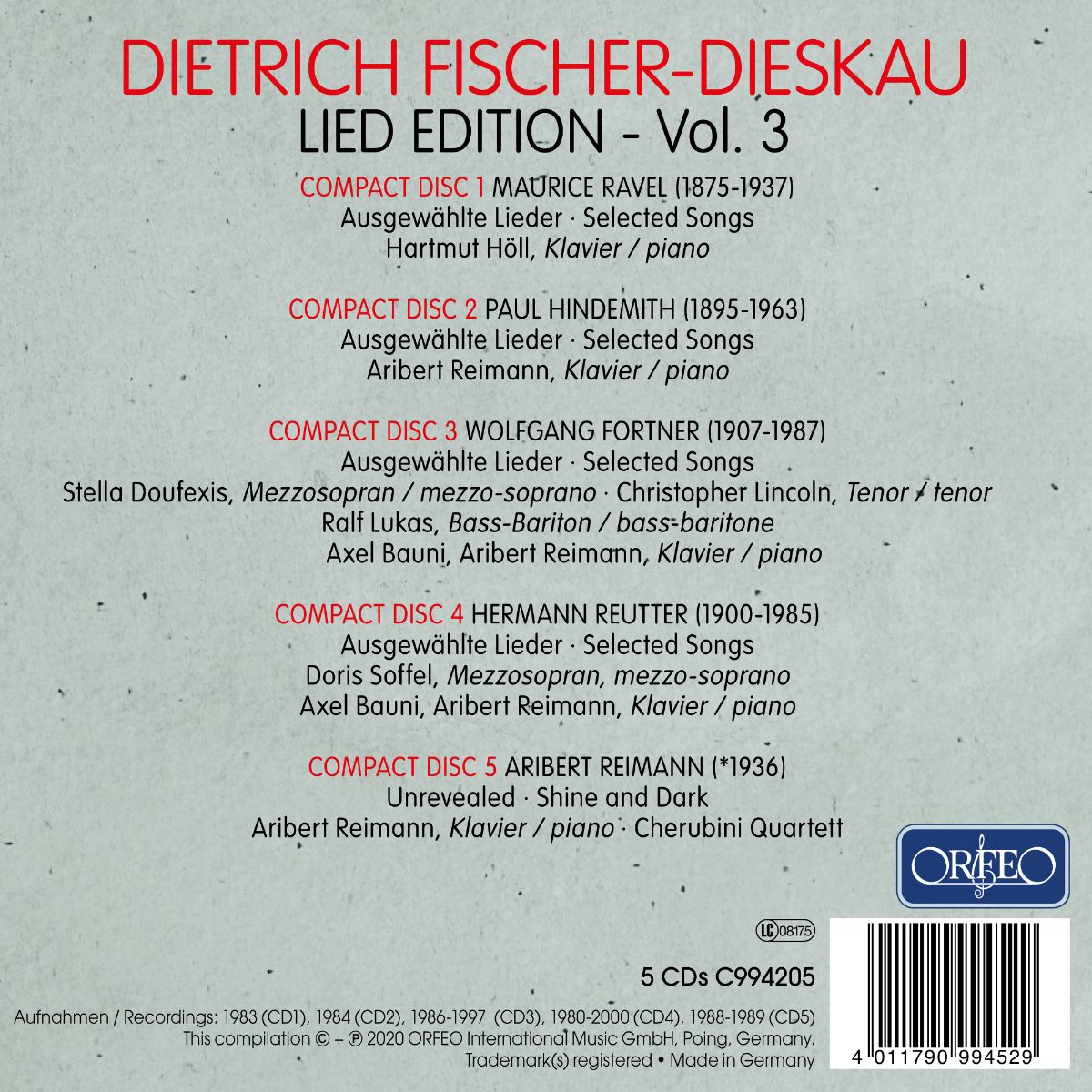 Auf CD1 präsentiert Fischer-Dieskau mit seinem in späten Jahren bevorzugten Lied-Partner Hartmut Höll eine überaus reizvoll zusammen gestellte Auswahl an außerhalb Frankreichs nur sporadisch aufgeführten Liedern Maurice Ravels. Noch weniger beachtet wird das Lied-Schaffen Paul Hindemiths (CD2), zu Unrecht, wie diese Aufnahmen belegen. Großen Anteil an der so natürlich wie eindringlichen Gestaltung der Lieder hat in dieser Aufnahme Aribert Reimann als Lied-Begleiter, der für Fischer-Dieskau wenige Jahre zuvor die viersätzige Kantate „Unrevealed“ für Bariton und Streichquartett komponiert hatte (CD5). In Zusammenhang mit Aribert Reimann, der in Berlin eine Lied-Klasse leitete, entstanden auch die Hermann Reutter (CD4) und Wolfgang Fortner (CD3) gewidmeten Lied-Anthologien, die die Edition vervollständigen.