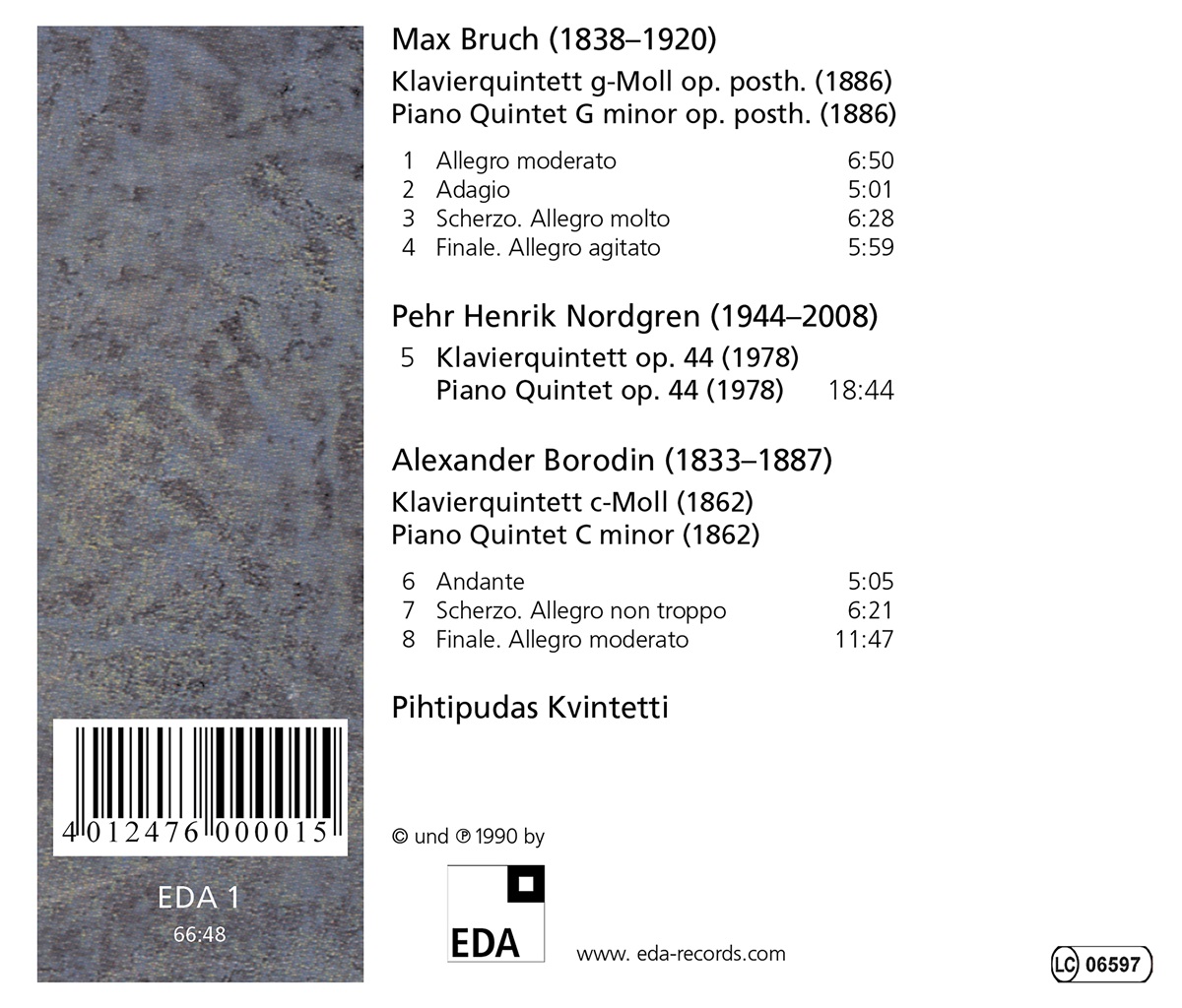 In seiner ersten Veröffentlichungsserie überhaupt widmete sich eda records seit den 1990er Jahren in insgesamt sechs Einspielungen der Gattung des Klavierquintetts, etliche der Produktionen waren Weltersteinspielungen. Das finnisch-deutsche PIHITPUDAS KVINTETTI (Pihtipudas Piano Quintet), künstlerischer Partner von eda records bei diesem Projekt, ist bis heute das einzige professionelle Kammerensemble, das ausschließlich in dieser Besetzung arbeitet; es feierte im Jahr 2013 sein fünfundzwanzigjähriges Bestehen. Seither hat sich die renommierte Formation keineswegs nur mit den Kernwerken des Repertoires beschäftigt, sondern vielmehr zahlreiche unbekannte und vergessene Werke aufgefunden und wiedererweckt und das Spezialgenre des Klavierquintetts durch seine Entdeckungen und Einspielungen in besonderer Weise gepflegt. In der ersten Veröffentlichung, die gleichzeitig die Geburtsstunde des Labels eda records darstellte, beschäftigte sich das Ensemble mit zwei romantischen Werken, die nach ihrer Entstehung so gut wie unbekannt geblieben waren. Max Bruchs Klavierquintett g-Moll war erst wenige Jahre vor der Einspielung veröffentlicht worden, fast genau 100 Jahre nach seiner Entstehung. Bruch war kein großer Freund der Kammermusik; den Auftrag eines Vorstandmitgliedes der Liverpooler Philharmonischen Gesellschaft, deren Direktor Bruch gerade geworden war, mochte er dennoch nicht ausschlagen, erhoffte er sich doch nach vielversprechenden Anfängen in England eine weitere Verbreitung seiner Werke im anglo-amerikanischen Raum. Neun Jahre benötigte Bruch für die Fertigstellung des Werkes, das zu seinen Lebzeiten nicht einmal gedruckt worden ist. Erst 1988 erschien die posthume Erstveröffentlichung dieser zu Unrecht vergessenen Preziose der Quintettliteratur. Alexander Borodins frühes Klavierquintett c-Moll gehört in die frühe Phase seiner Beschäftigung mit dem Komponieren. Er schrieb es 28-jährig auf einer Reise nach Italien, angestiftet von der jungen Pianistin Katarina Protopowa, mit der er sich später verheiratete. Auf dieser Reise es war das Jahr 1862 erreichte Borodin auch der Ruf nach St. Petersburg, aber nicht etwa als Komponist, sondern als Chemiker. Im gleichen Jahr traf er mit Balakirew zusammen, der ihm Unterricht erteilen sollte, um seine schon früh entwickelten musikalischen Neigungen zu kanalisieren. Die Frische dieses unverkrampften Quintetts in seiner Mischung aus liedhaften russischen Elementen und geradezu lokaltypischer Elegik nimmt den Hörer unmittelbar für sich ein. Zwischen diesen beiden romantischen Mittelgewichten steht als Hommage des Ensembles an seine Hauptwirkungsstätte in Finnland das Quintett von Pehr Henrik Nordgren, eine faszinierende Melange aus nordisch-finnischen und fernöstlichen Klängen und Traditionen. Nordgren lebte lange Jahre in Japan und bezog in seine Werke die im weitesten Sinn volkstümlichen Musiktraditionen seiner beiden Lebensmittelpunkte ein.