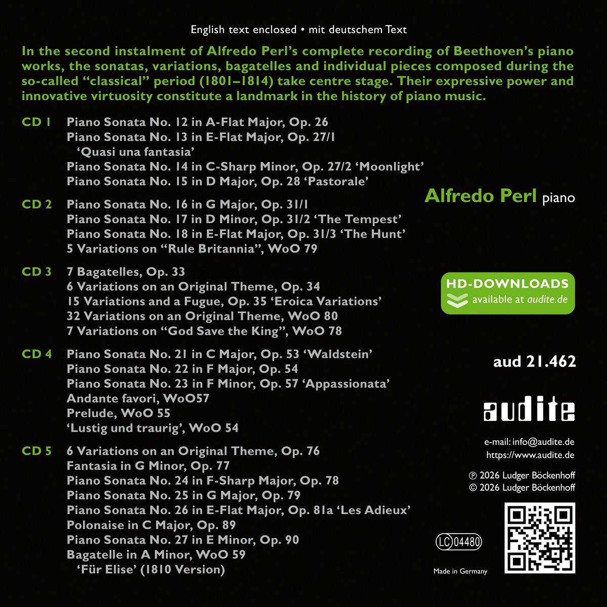 Nach dem international gefeierten ersten Teil von Alfredo Perls dreiteiliger Gesamteinspielung der Klaviermusik Ludwig van Beethovens umspannt die zweite Box den Zeitraum der Jahre 1801–1814. Schon früh sprach die Literatur hier von einer ‚mittleren’ oder ‚klassischen’ Schaffensphase: Dies verstellt jedoch den Blick auf ein kompositorisches Denken, das wesentlich durch den Rückgriff auf Früheres und den Vorgriff auf Kommendes sowie die Identifizierung Beethovens mit seinem Instrument geprägt ist. Das Klavier war für ihn Werkzeug einer Selbst- und Welterfahrung, um Intimstes und Persönlichstes auf der einen und kollektive geschichtlich-politische Umbrüche auf der anderen Seite zu verarbeiten. Von den 14 hier zu hörenden Sonaten zählen mindestens sechs zum Kernrepertoire jedes Pianisten, deren Popularität sich in den zumeist nicht von Beethoven stammenden Beinamen widerspiegelt: „Mondschein“ (op. 27/2), „Pastorale“ (op. 28), „Der Sturm“ (op. 31/2), „Waldstein“ (op. 53), „Appassionata“ (op. 57) und „Les Adieux“ (op. 81a). Unter den Variationen besitzen die „Eroica“-Variationen op. 35 und die c-Moll-Variationen WoO 80 seit langem eine besondere Attraktion für Pianisten und Publikum. Am berühmtesten wurde das 1810 komponierte Klavierstück „Für Elise“, das für Beethoven nicht mehr als eine Fingerübung gewesen sein mag, aber seine Fähigkeit demonstriert, mit einfachsten Motiven und Gesten eine musikalische Welt zu erschaffen. Dieses Spektrum von elementarer Ausdruckskraft und neuartiger Virtuosität macht klar, warum Beethovens Klavierwerke aus dieser Zeit zu einem Meilenstein in der Geschichte der Klaviermusik geworden sind. Der erfahrene Beethoven-Interpret Alfredo Perl spielt die Stücke pointiert und virtuos neu ein.