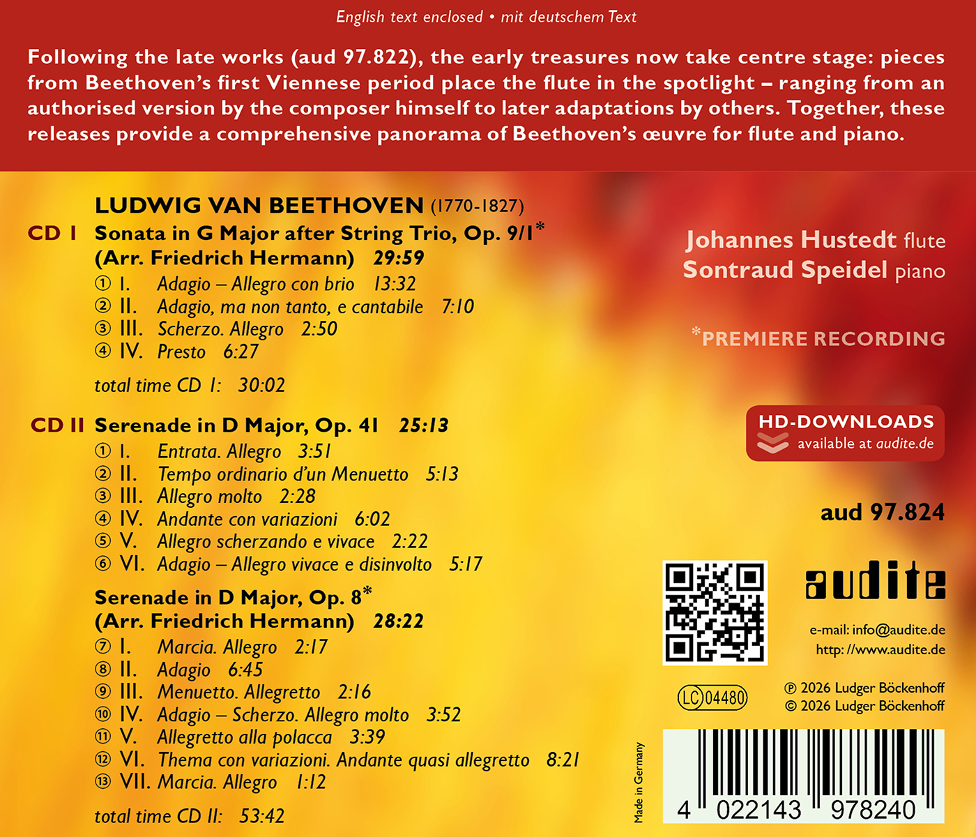 Mit „Beethoven für Flöte und Klavier – Teil II“ ist die Fortsetzung und gleichzeitig der Abschluss der kleinen Reihe, die Ludwig van Beethovens Schaffen für diese Besetzung beleuchtet. Während die erste Veröffentlichung „But in my style!“ den Fokus auf die späten Werke legte, widmet sich das neue Doppelalbum der frühen Wiener Phase des Komponisten. Hier tritt die Flöte nicht nur als ad libitum-Instrument auf, sondern rückt als klangliches Zentrum der Kompositionen und Bearbeitungen in den Vordergrund. Das Spektrum reicht von einer vom Komponisten selbst korrigierten und autorisierten Bearbeitung bis hin zu Adaptionen Friedrich Hermanns. Auf diese Weise öffnet die Auswahl zugleich ein Fenster zur historischen Rezeption von Beethovens Werken. Im Zusammenspiel mit dem ersten Teil entsteht so ein facettenreiches Panorama des Beethoven’schen Œuvres für Flöte und Klavier. Sowohl bei der Sonate in G-Dur als auch bei der Serenade in D-Dur handelt es sich um Bearbeitungen von Friedrich Hermann, die hier als Ersteinspielung vorliegen. Die Stücke wurden wiederum von Johannes Hustedt (Flöte) und Sontraud Speidel (Klavier) eingespielt.