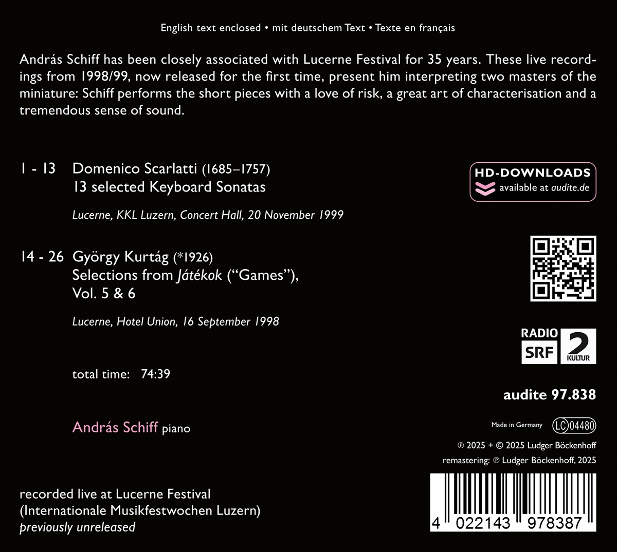 Zwei erstmals veröffentlichte Live-Mitschnitte aus Luzern zeigen Sir András Schiff mit zwei Komponisten, die in seiner Diskografie und seinen Programmen sonst kaum anzutreffen sind: Domenico Scarlatti und György Kurtág trennen Jahrhunderte, doch musikalisch stehen sie sich als Meister der Miniatur nahe. Obwohl sich András Schiff mit Scarlatti bereits während seines Studiums auseinandergesetzt hatte, verschwand dieser Barockmeister anschließend sukzessive aus seinem Repertoire. In Luzern interpretierte Schiff in wohldurchdachter Dramaturgie 13 ausgewählte Sonaten und gestaltet die kurzen Werke – der Live-Situation entsprechend – risikofreudig, mit großer Charakterisierungskunst und ungeheurem Klangsinn. Auch aus György Kurtágs Játékok („Spiele“), einer tagebuchartigen Sammlung von Klavierminiaturen, präsentierte Schiff eine wohldurchdachte Auswahl, bei deren Zusammenstellung er Vorschläge von Kurtág selbst aufgriff. Schiff studierte in Budapest mehrere Jahre bei Kurtág, verehrt ihn als Komponisten, der „zu jedem Ton eine wichtige Meinung hat und genau weiß, wie er ihn hört“, hat bislang aber keine Einspielung seiner Musik vorlegt. Mit dieser Veröffentlichung gratuliert er Kurtág zum 100. Geburtstag am 19. Februar 2026.