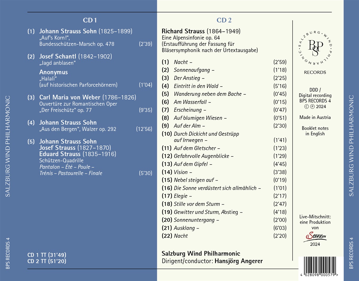 Das neue Album der Salzburg Wind Philharmonic unter der Leitung von Hansjörg Angerer kombiniert auf originelle Weise die beiden großen Strauss-e der Musikgeschichte. Der erste Teil des Doppelalbums enthält romantische Jagd- und Marschmusik von Johann Strauss II und einigen seiner Zeitgenossen, das zweite Album enthält Richard Strauss monumentales Werk "Eine Alpensinfonie" in der Erstaufführung der Fassung für Bläsersymphonik nach der Urtextausgabe.