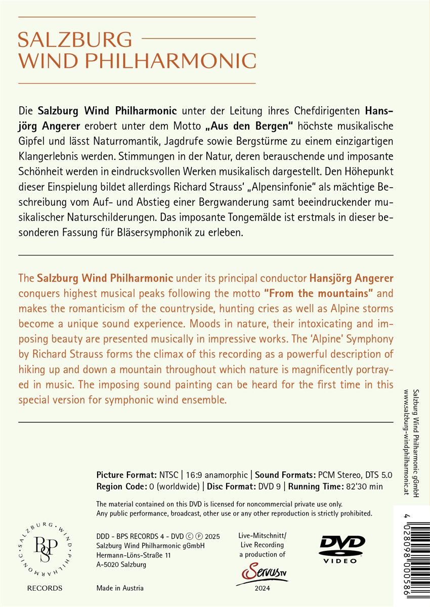 Diese DVD der Salzburg Wind Philharmonic unter der Leitung von Hansjörg Angerer kombiniert auf originelle Weise die beiden großen Strauss-e der Musikgeschichte. Sie enstand als audiovisueller Live-Mitschnitt des vielumjubelten Dreikönigskonzertes 2024 aus dem Großen Festspielhaus Salzburg. Der erste Teil des Konzert enthält romantische Jagd- und Marschmusik von Johann Strauss II und einigen seiner Zeitgenossen, der zweite Teil enthält Richard Strauss' monumentales Werk „Eine Alpensinfonie“. Sämtliche Werke erklingen in Fassungen für Bläsersymphonik von Albert Schwarzmann, erstellt nach Urtextausgaben.