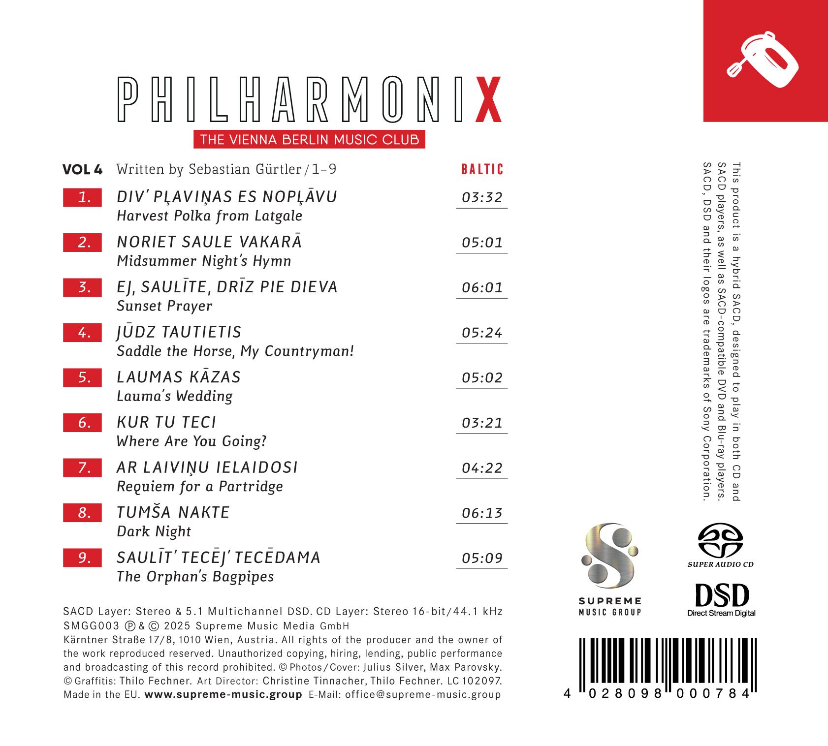 Das neue Album der Philharmonix VOL 4 „Baltic“, widmet sich, wie der Titel schon verrät, der Musik des Baltikums, speziell jener Lettlands. Sebastian Gürtler, zusammen mit Stephan Koncz Komponist der gesamten Philharmonix-Literatur, ließ sich von Melodien, Volkswaisen und Kinderliedern Lettlands inspirieren und schuf diesen Zyklus an Werken, in einer ganz eigenen intim geprägten, oftmals melancholisch-tänzerischen, aber gelegentlich auch hymnisch-singenden Tonsprache.