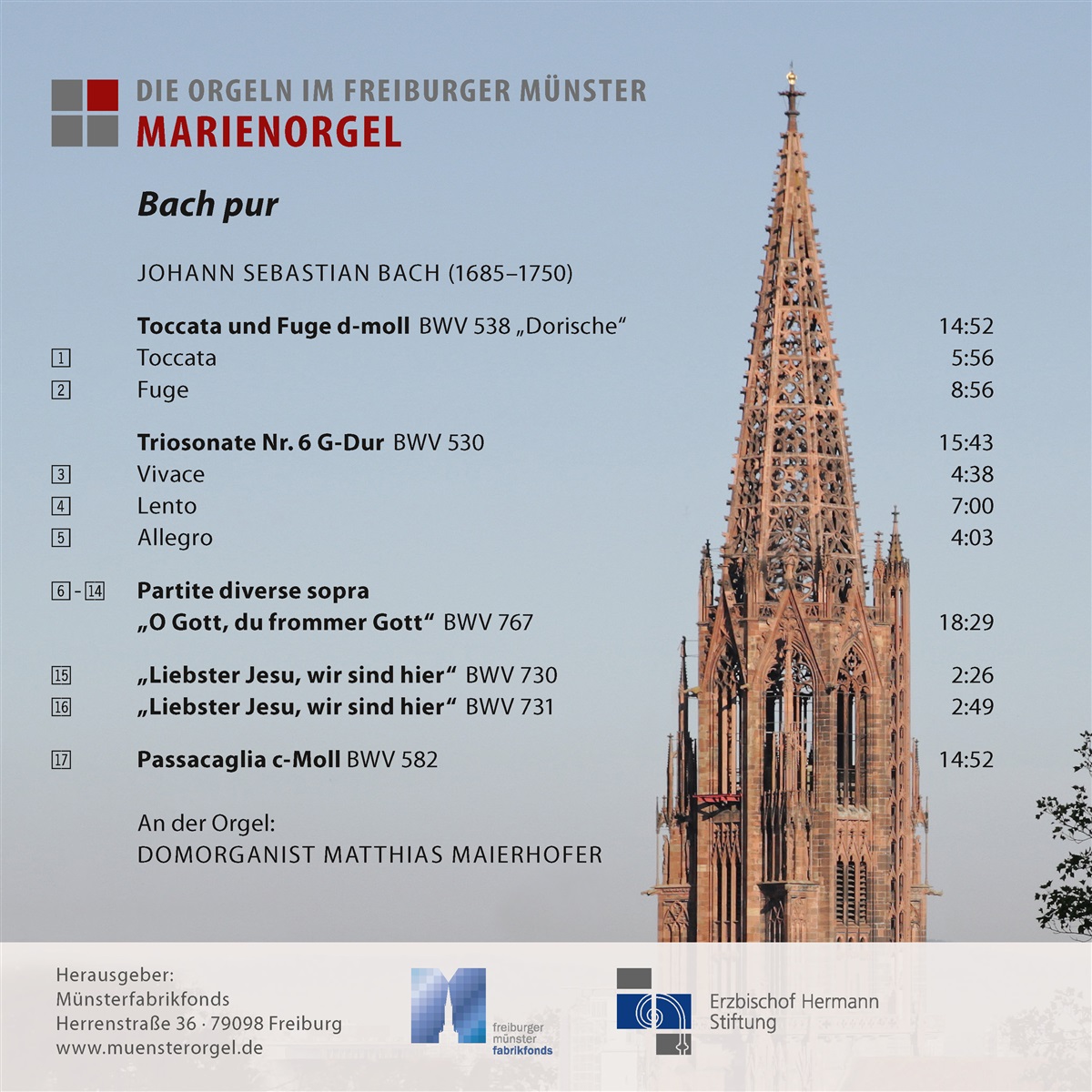 Domorganist Matthias Maierhofer stellt auf dem vorliegenden Album die Marienorgel vor, die von der Firma Rieger im Jahr 1964 als Hauptorgel des Freiburger Münsters erbaut wurde. Inspiriert vom Orgelbau der Barockzeit entstand eine auch mechanisch zu spielende Orgel, die bestens dazu geeignet ist, Musik von Johann Sebastian Bach werkdienlich und durchhörbar erklingen zu lassen. Zu hören ist ein Querschnitt seines Orgelschaffens mit Choralbearbeitungen, einer virtuosen Triosonate, der „Dorischen“ Toccata und Fuge sowie der berühmten „Passacaglia“, die Bach als einzigartigen ‚Architekten der Klänge‘ (Albert Schweitzer) zeigt.