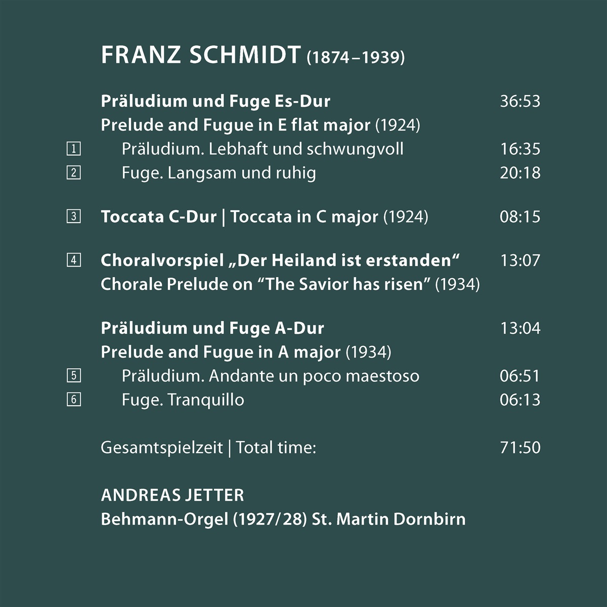 Der österreichische Komponist Franz Schmidt gilt als einer der letzten Spätromantiker seines Landes: Seine Musik zeichnet sich durch eine individuelle Tonsprache mit subtilen Harmonien aus. Anlässlich seines 150. Geburtstages startet Andreas Jetter (Domorganist am Dom zu Chur) eine Gesamteinspielung der Orgelwerke von Franz Schmidt. Unter dem Motto „Silberglanz“ präsentiert Jetter im zweiten Teil zwei bedeutende Werke aus dem Jahr 1924: Zum einen das „Präludium und Fuge“ in Es-Dur, das schon allein aufgrund seiner Spieldauer zu den größten Orgelstücken überhaupt zählt. Zum anderen – in deutlichem Kontrast dazu – die „Toccata“ in C-Dur, ein eher kurzes und für Schmidts Verhältnisse einzigartig virtuoses Orgelwerk. Aus der späten Schaffensperiode des Komponisten stammen das Choralvorspiel „Der Heiland ist erstanden“ und das Präludium und Fuge in A-Dur. Letzteres ist auch als „Weihnachts-Pastorale“ bekannt, was den Charakter der Komposition in ihrer heiteren Ruhe, Intimität und Schönheit wunderbar beschreibt. Vol. 2 wurde an der ‚Monumentalorgel‘ von Josef Behmann in der Pfarrkirche St. Martin in Dornbirn/Vorarlberg aufgenommen, die 1927/28 erbaut und sorgfältig in ihren ursprünglichen Zustand ohne jegliche Änderungen zurückversetzt wurde.