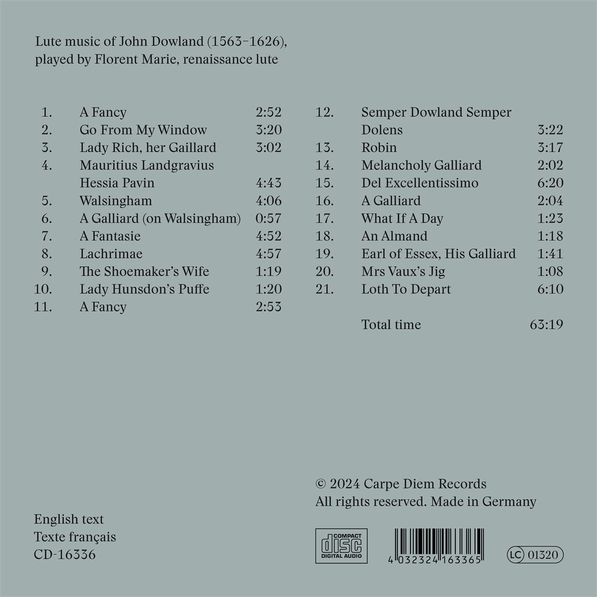 Der französische Lautenist Florent Marie präsentiert sein zweites Soloalbum bei Carpe Diem Records: Eine Sammlung von Renaissance-Lautenmusik des berühmten John Dowland. Aufgenommen in einer kleinen Kirche auf dem normannischen Land, enthält dieses Album sowohl melancholische als auch aufmunternde Kompositionen des großen englischen Meisters der Laute, die eine emotionale und farbenfrohe Wiedergabe dieser meist bekannten und beliebten Stücke darstellen.