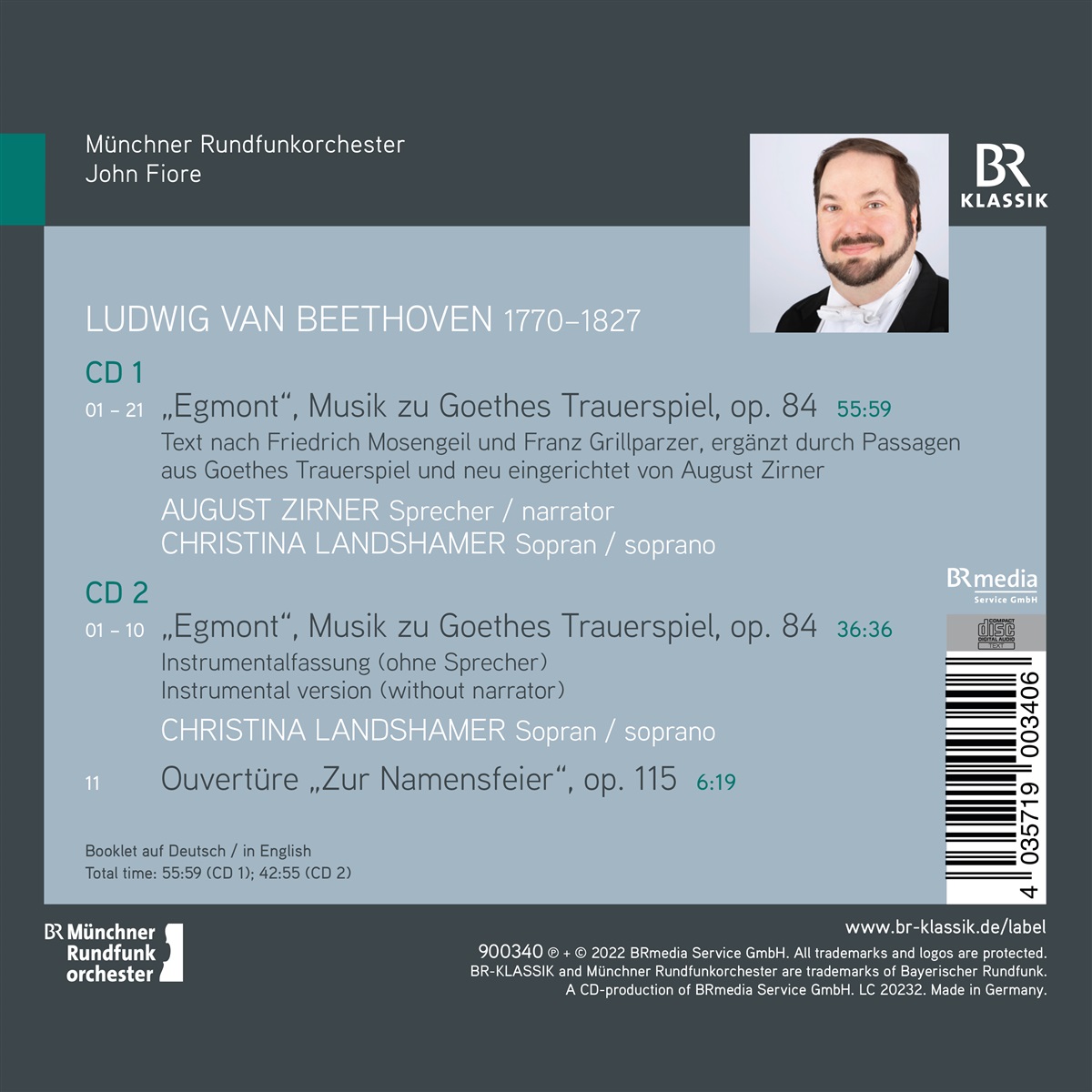 In dieser Aufnahme ist Beethovens Bühnenmusik zu Goethes "Egmont" in ihrer Gesamtheit zu erleben. CD1 bietet die vollständige Fassung mit Deklamation und Musik, während CD2 nur Beethovens Musik enthält. Die Box enthält auch eine Einspielung von Beethovens Ouvertüre "Zur Namensfeier". Es deklamiert der bekannte Schauspieler August Zirner, der den Text von Friedrich Mosengeil und Franz Grillparzer sowie Passagen aus Goethes Drama neu arrangiert hat.
